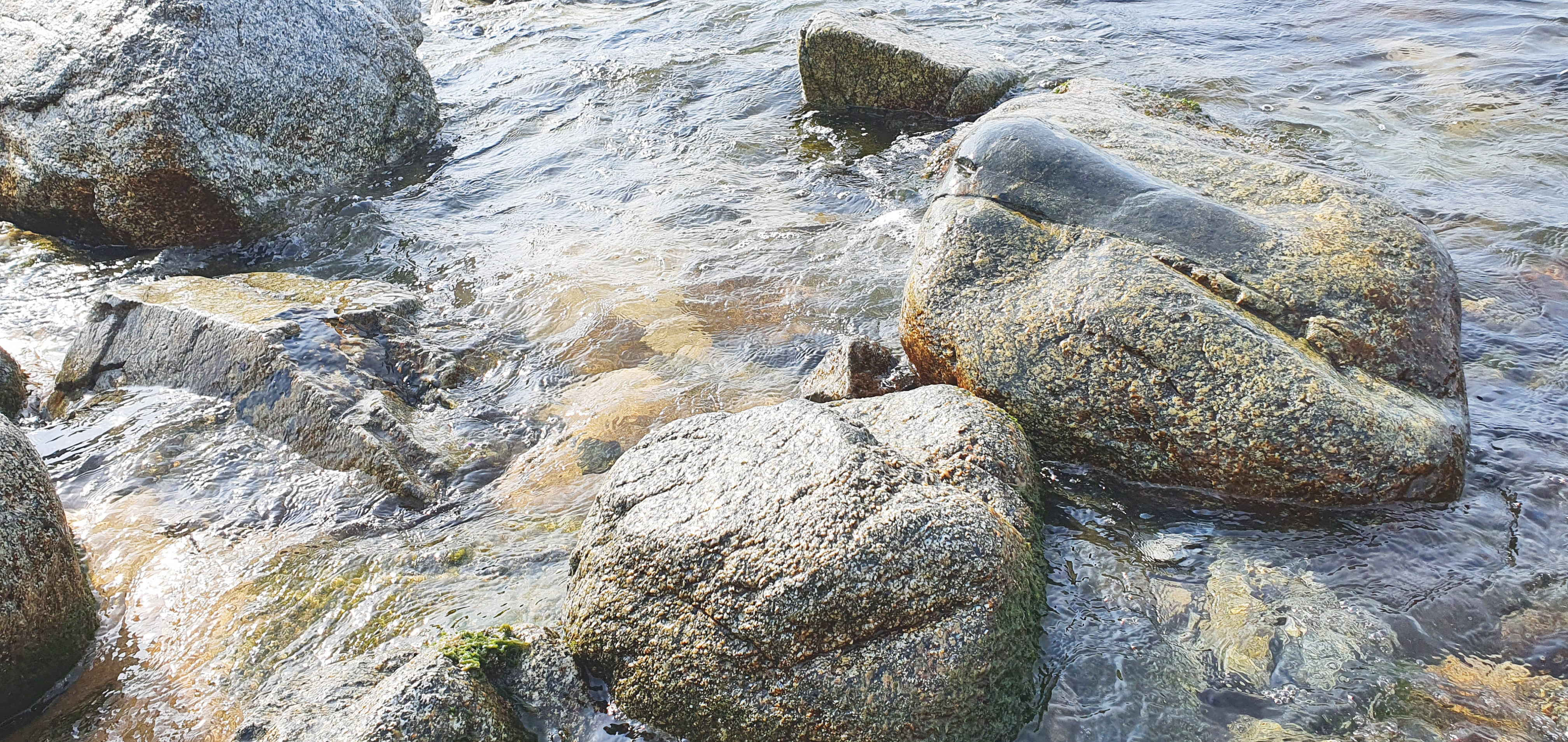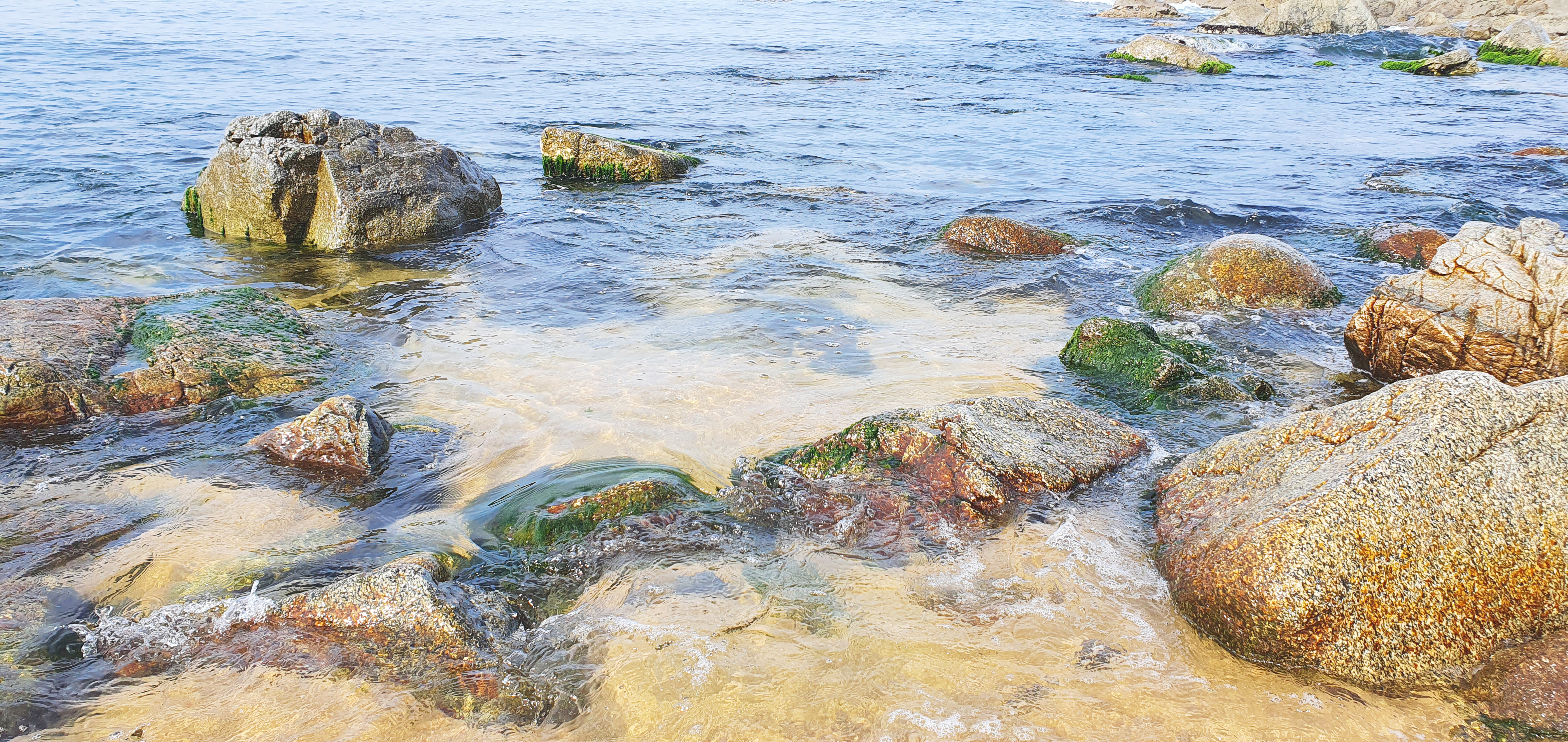 - 작은 바위들에 부지런히 부딛히는 파도, 햇빛에 비춰 반짝이는 잔 물결