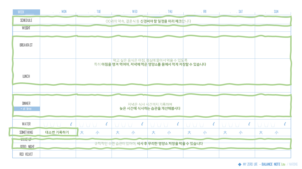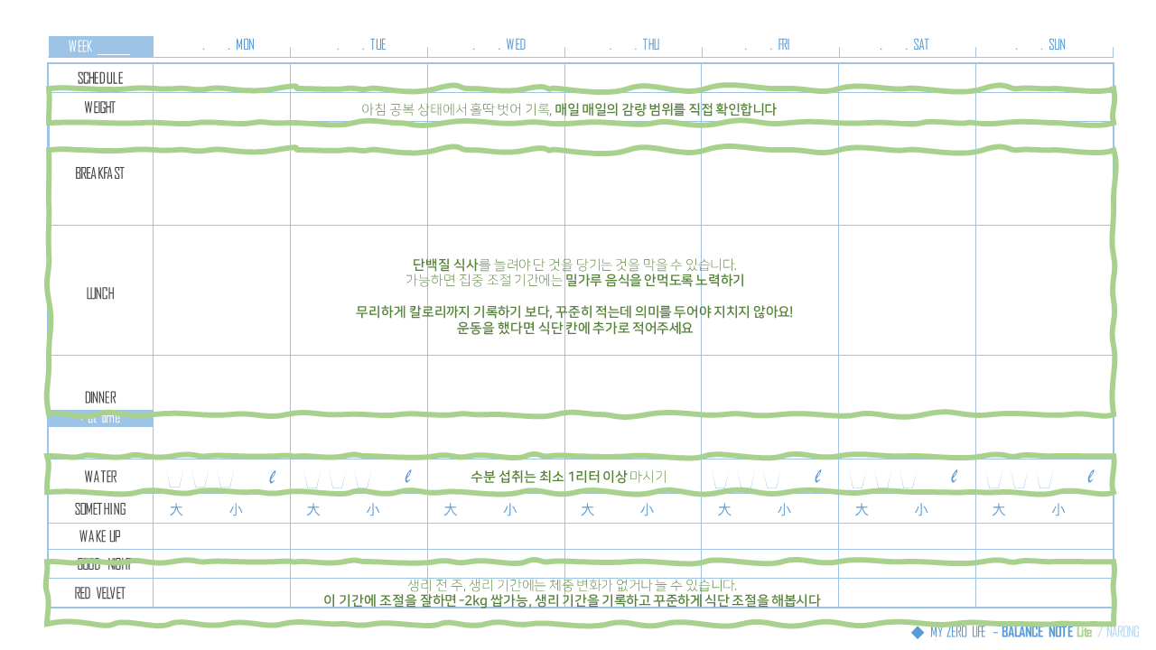 위클리 파트에는 일정, 매일 몸무게, 하루의 식단, 수분 섭취, 대소변, 기상&취침 시간, 생리 기간을 체크하고 기록하도록 만들었어요. 각 파트에는 가이드 형태로 팁을 적어 두었습니다. 특히 아침을 단백질 위주로 챙겨먹는게 큰 도움이 된답니다. 스케쥴 여부와 생리 기간을 기록하여 적어두면, 특정 기간에 체중이 정체하거나 멈추더라도 꾸준히 이어갈 수 있답니다.