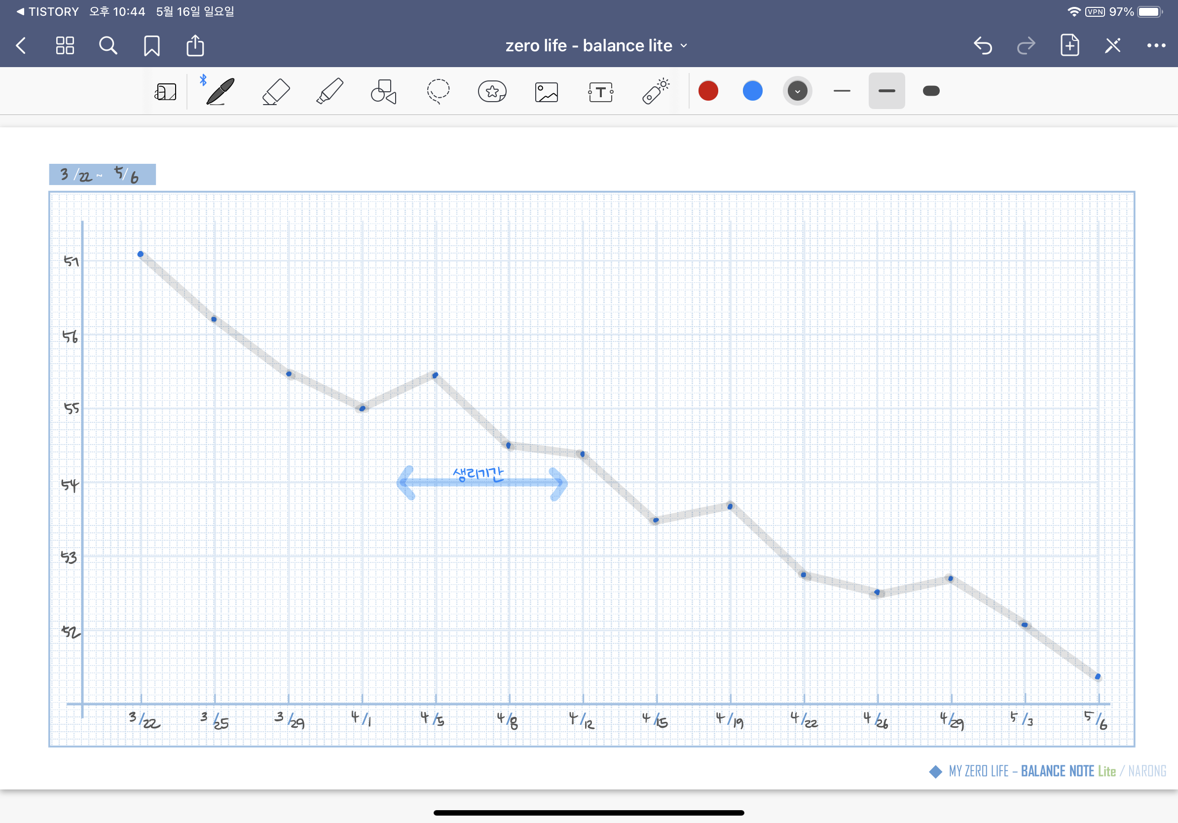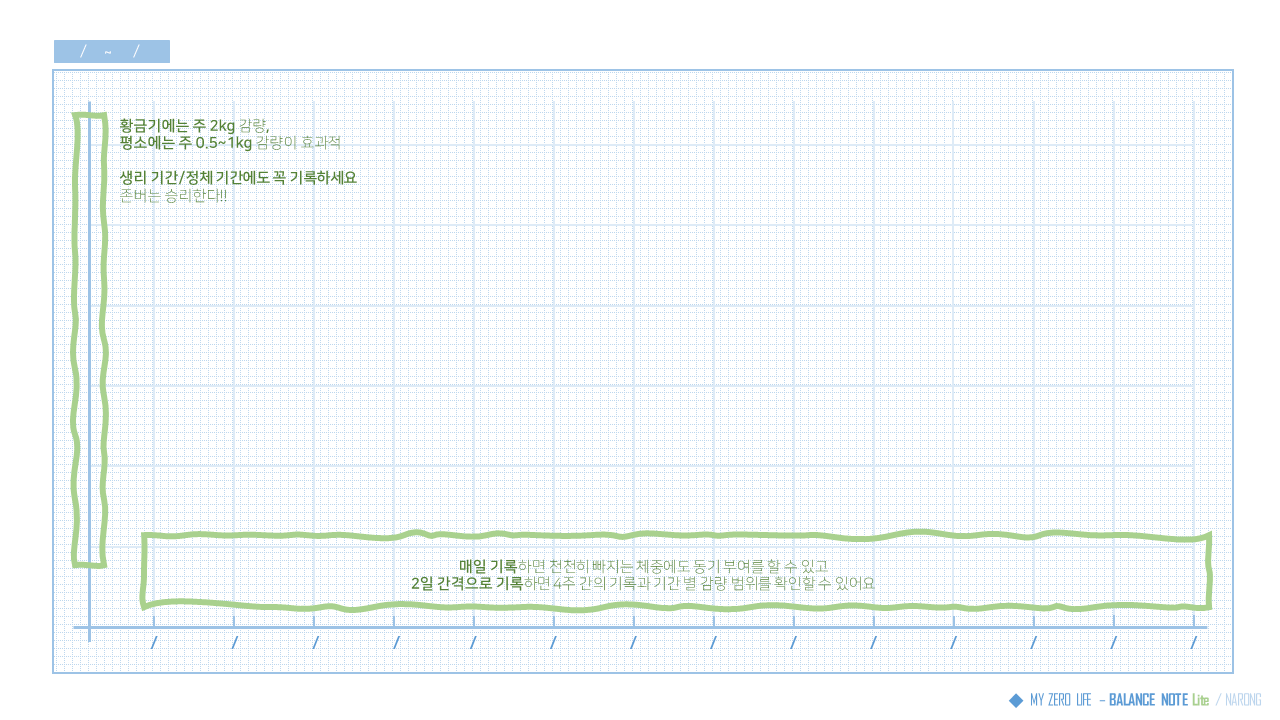 체중 그래프를 두어 감량하는 느낌을 체감할 수 있어요. 개인적으로 매일 작성하기 보다는 일주일 단위로 체중 흐름을 체크하는 느낌으로 작성하는게 동기 부여가 된답니다! y축은 몸무게, x축은 날짜를 작성하면 된답니다.