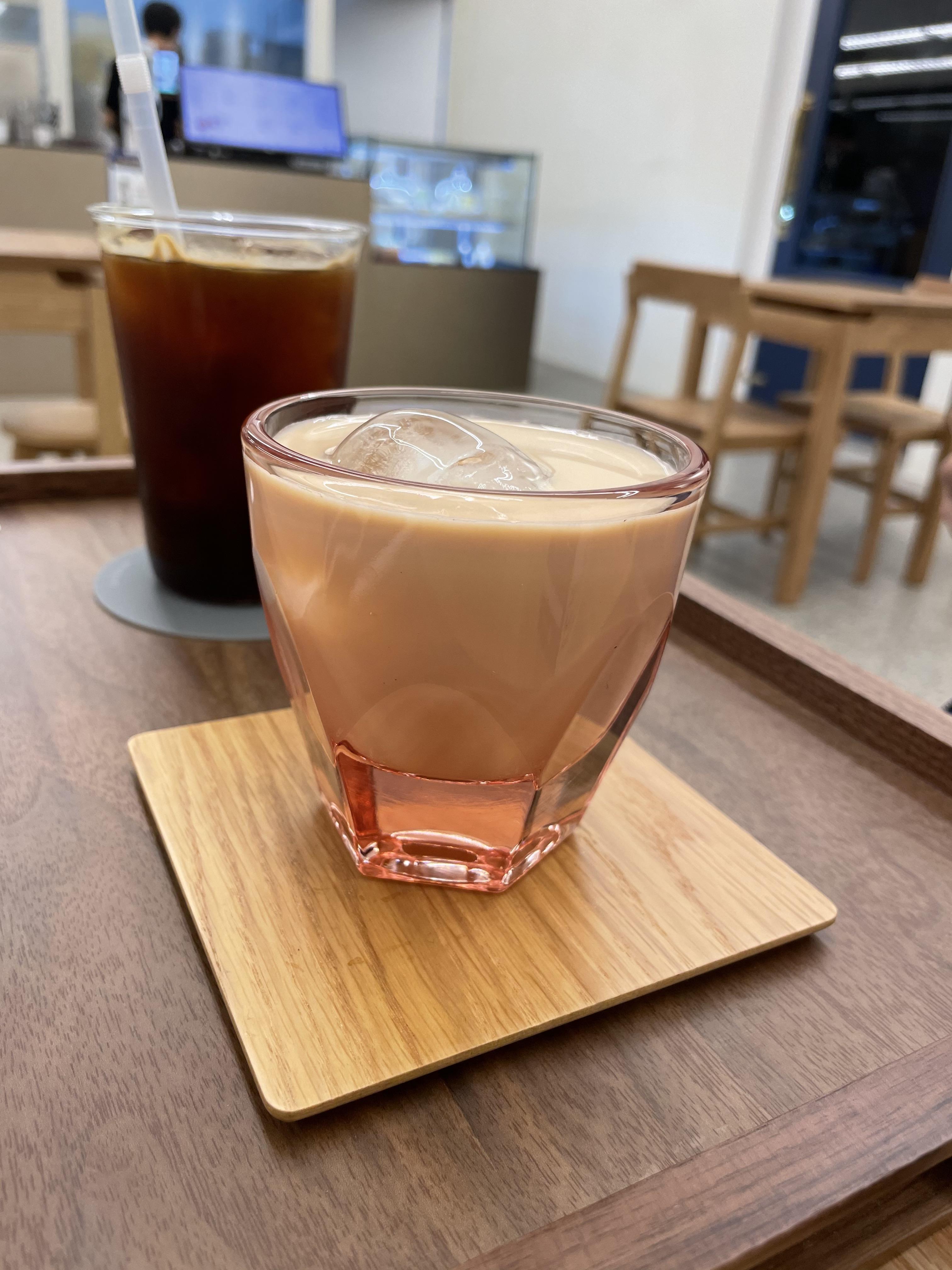 [메뉴] 로스터리 카페니 핸드드립이나 원두를 사용하는 음료를 시키고 싶었는데요. 아쉽게도 저녁이라 커피는 못마시고 시그니처 라인으로 시켰어요. 로즈시나몬은 모험을 하게 될 것같아 차이티라떼를 골랐고, 동글이는 아아를 시켰어요. 이슬차는 무엇일까요, 내가 아는 그 이슬인가 ^_^!? 저는 쇼케이스에 있는 차이라떼를 바로 받을 수 있었어요.