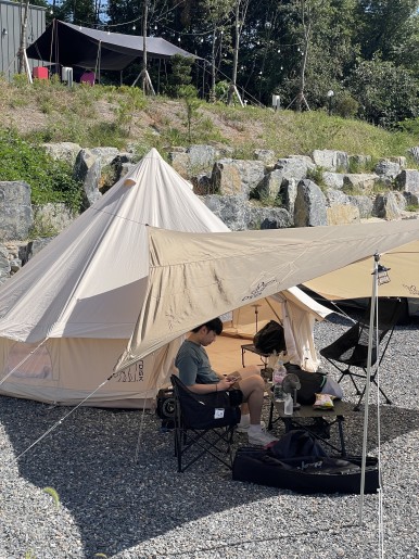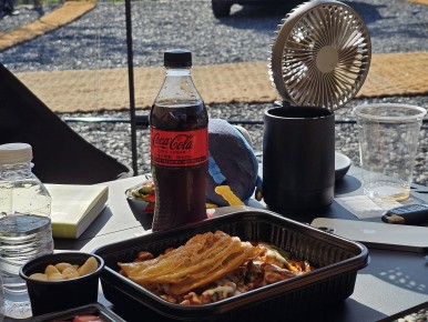 여름날에 텐트를 칠 때 고려해야 할 것이 있었다 바로 해의 방향..! 우리의 실수는 해가 높이 떠 있을 땐 몰랐는데 3~4시 쯤 해가 내려갈 때의 방향을 고려하지 못했다는 거다. 해가 내려가는 방향과 우리가 쳐놓은 타프/입구 방향이 똑같아서 엄청난 눈부심과 더위를 감당해야했다. 캠핑장 사장님이 짠해서 빌려주신 선풍기로 의지하면서 오후를 버텼다 정말 ㅠ