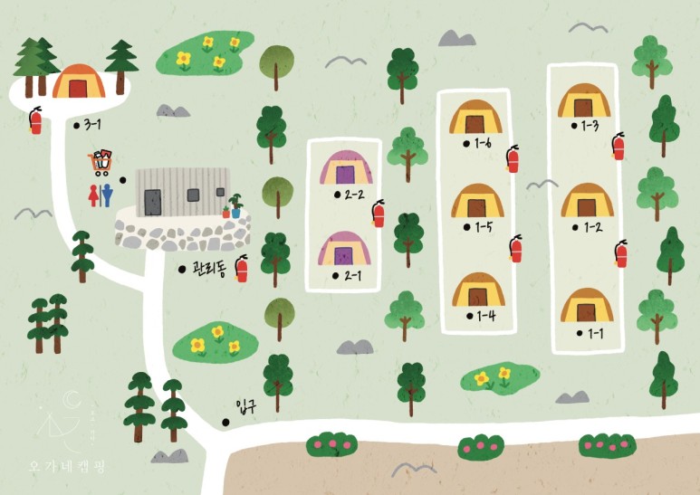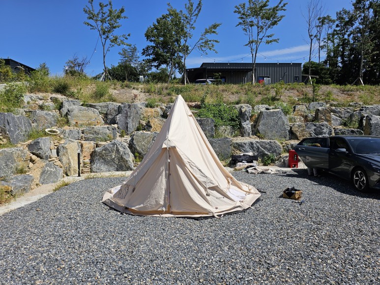총 8개 사이트가 소규모로 운영되는 곳이고 내가 예약한 곳은 3-1 캠프닉 공간이다. 근데 3-1 공간은 내가 갔을 때 아직 사이트를 만드는 중이었고 실제로는 1-4 공간에서 머물러야 했다. 사정을 친절히 설명하시면서 원하면 취소해드리겠다고 말씀주셨는데 어짜피 나랑 동글이는 텐트를 쳐보는 데 의의를 둔 거라 가기로 했다. 여기 사장님이 진~짜 친절하시다.