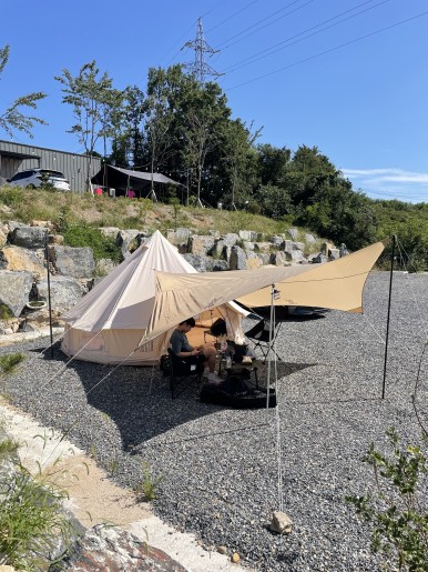 땀 줄줄 흘려가며 26개의 팩질로 완성된 우리의 첫 텐! 트! 텐트랑 연결되게 타프를 치려면 폴대를 텐트 뒤로 넘겨야 한다고 사장님이 알려주셨다. 사장님의 은혜로 캠핑장 초보도 느낌있게 텐트 완성! 근데 엄청 더워서 번갈아가며 샤워하러갔다. 샤워장 사진은 따로 못찍었는데 샤워기는 2대가 있고 샤워 커튼으로 나름(?) 독립적으로 씻을 수 있다. 날씨가 진짜 너무너무 좋았다고 한다.