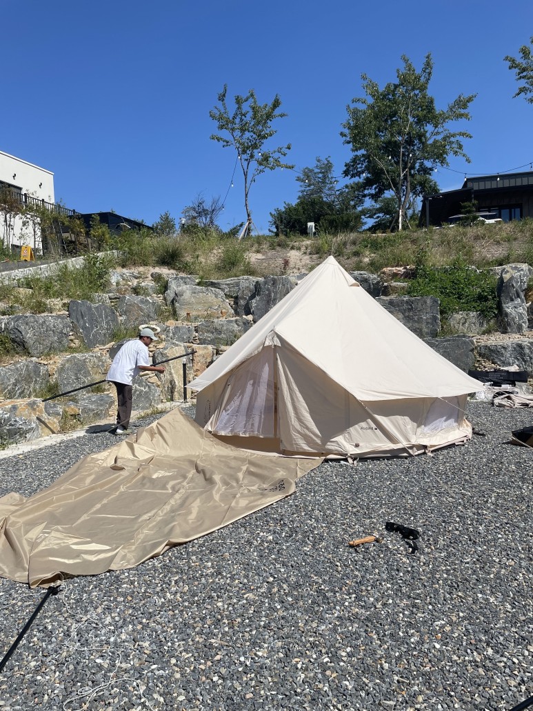 9월 첫째주 땡볕에 면 텐트 들고 온 사람 나야 나 ^_^! 겁도없이 첫 텐트로 노르디스크를 고른 동글이와 나는 엄청난 고생을 했다고 한다. 사진은 고생해서 텐트를 세우고, 캠핑장 사장님이 타프 같이 쳐주시는 장면이다. 첫 캠핑에 당일 치기에 면 텐트를 들고 온 우리를 보고 얼마나 당황하셨을까.. 짠한 우리를 보고 타프치는 걸 도와주신다고 하셨다. 덕분에 타프와 텐트가 이어지는 예쁜 공간을 만들 수 있었다. 이 자리를 빌어 감사의 말씀을 전합니다.