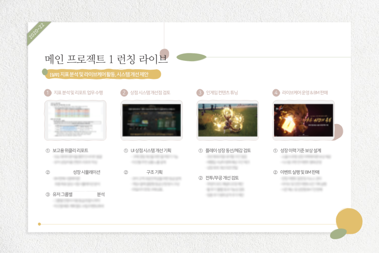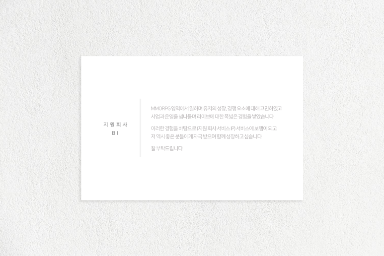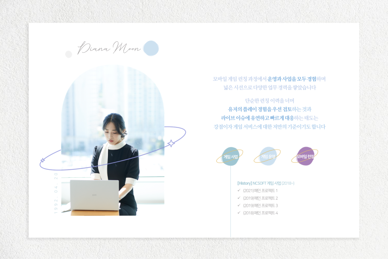 2022년 상반기 기준 작성된 디자인이다. 아래 디자인에서 텍스트를 바꿀 수 있는 PPT 형태로 발송된다. 내용을 보강해도 좋고, 이미지랑 텍스트만 바꿔서 써도 무방할 것 같다. 이거 외에 2017년도에 만든 인턴 포트폴리오가 있는데 이것도 차근차근 올려야겠다. 5년이 지났는데도 지금와서 봐도 꽤 괜찮은 것 같다. 이래서 내가 다 프리패스했었지....(라떼는 말야!)