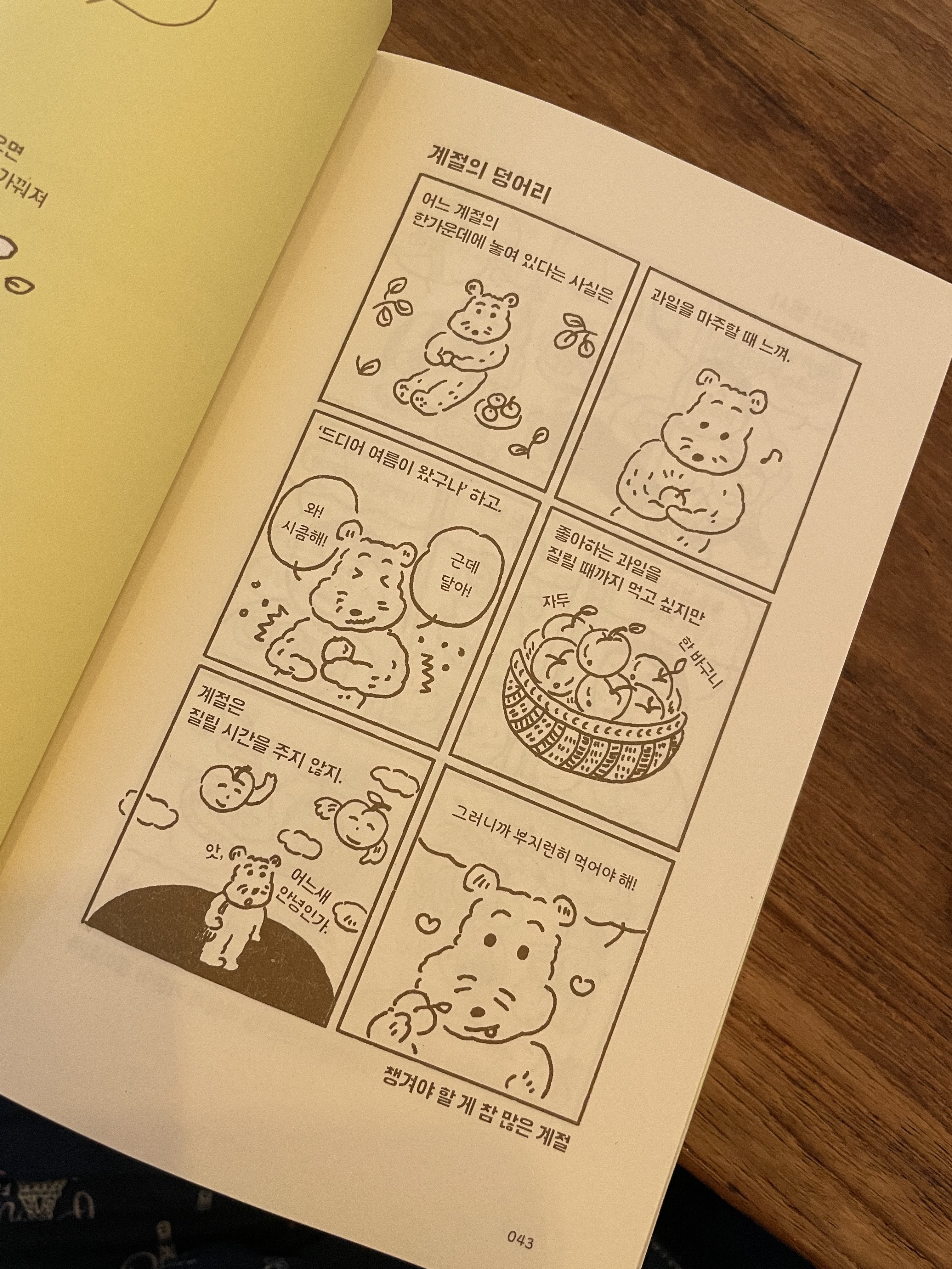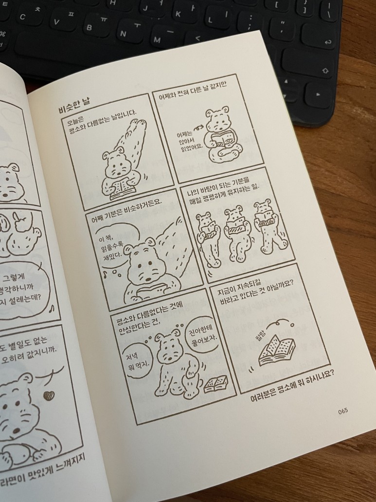 비슷한 하루처럼 보이지만 개인마다 겪는 하루가 다르고, 내가 겪은 하루도 매일 다르다. 그래서일까? 한 장 한 장 넘길 때 마다 내 이야기를 하고 싶어 안달이 났다. '나도 비슷한데!' 또는 '작가가 무엇을 말하고 싶은 지 알겠어!'같은 말을 너무 하고 싶었다. 나뿐 아니라 책을 읽는 많은 독자들이 조잘거리고 싶은 자신만의 하루를 가지고 있을 거라는 상상을 해본다.