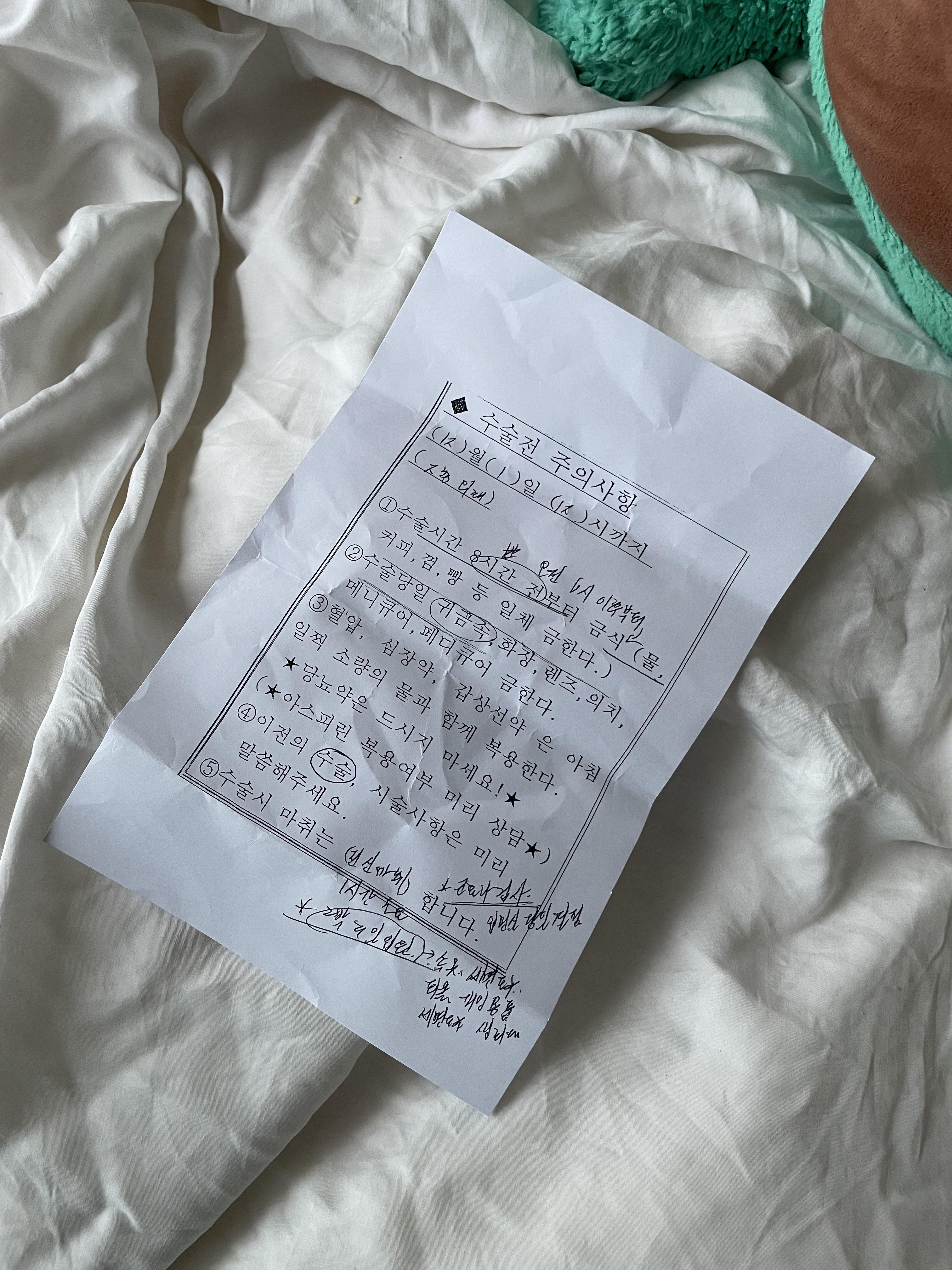 2세 계획을 위해 이번에도 미루고 있던 산부인과를 찾았다. 요즘 오른쪽 배 아랫쪽도 간헐적으로 아픈데, 물혹이 커져서 아픈건가 싶어서 겸사겸사. 검사 결과 조치가 필요한 물혹은 왼쪽에 있기 때문에 오른쪽 복부 통증과는 연관성이 없다고 했다. 물혹은 길게 잡으면 6cm까지 되는데 원래 커졌다 작아졌다하는거라고 했다. 그리고 난소보다는 난관쪽에 가까이 있는 것 같은데 언제든지 뗄 수 있다고도 말씀주셨다. 이전에 임신 시도하다 안되면 물혹때문일 수도 있을 거라는 코멘트도 받은 상황이라 이번에 떼겠다고 했다. 생각해보니 내 인생의 첫 입원이었다. 복강경 수술 + 2박 3일 입원으로 한 200만원 정도 깨질 것 같다. 머리가 지끈지끈 ^_ㅠ