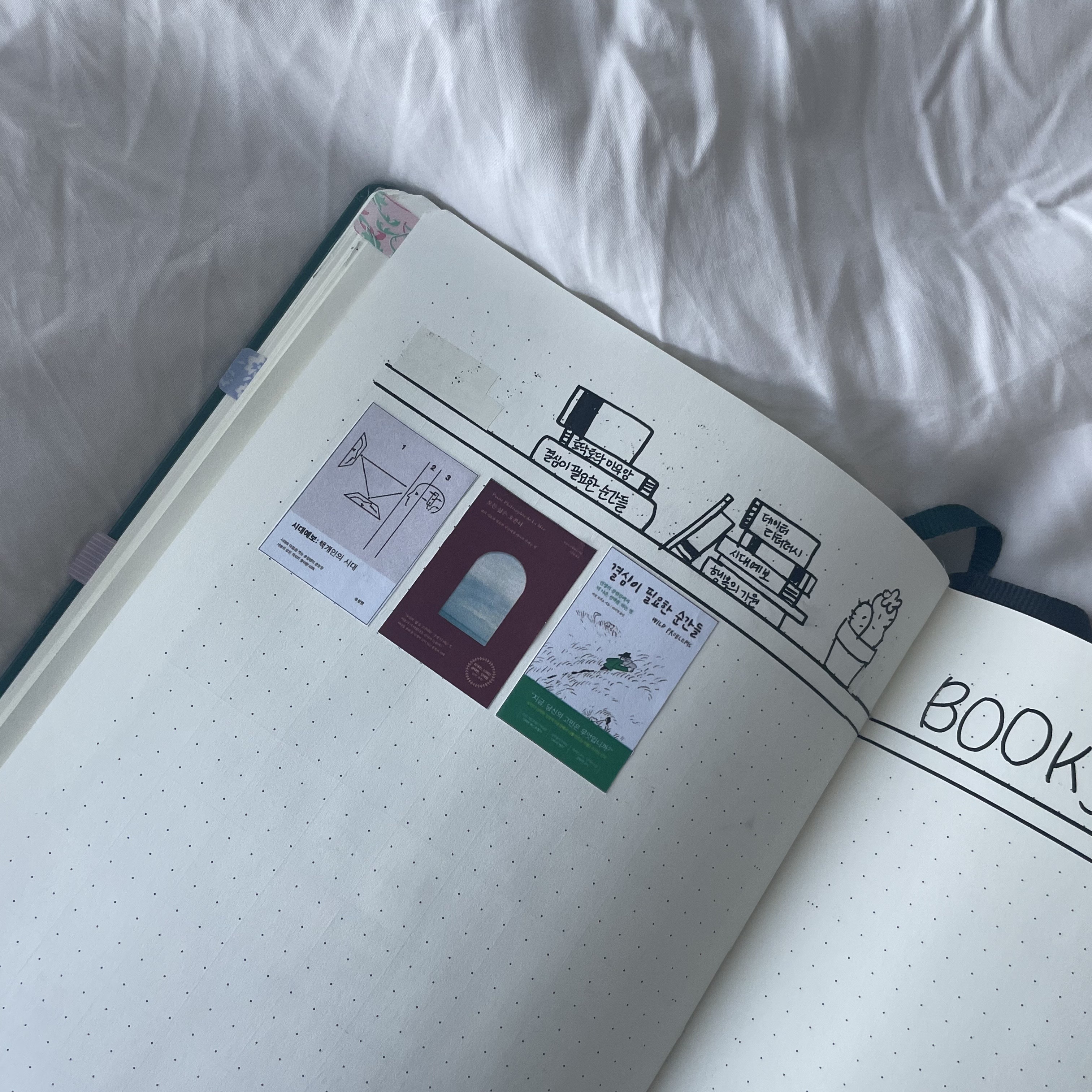 올 한 해동안 내가 읽을 책들을 정리해놓은 섹션이다. 저 사이즈의 사진을 출력하는 방법은, 파워포인트에서 책의 가로 사이즈를 5cm로 설정해놓고 출력할 책 이미지를 슬라이드에 다 모아놓은 뒤 출력할 때 2슬라이트로 뽑으면 된다. 책 요약/필사 노트는 따로 있고, 요건 독서를 끝낸 결과물만 볼 수 있는 페이지다. 원래 읽을 책 리스트는 오른쪽처럼 따로 만들어 관리하고 있었는데, 얘는 to do read의 느낌이라 다르단 말씀!