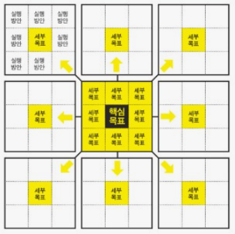 혹시나 어떻게 쓰는지 헷갈리는 사람은 왼쪽 이미지를 참고하면 된다. 정가운데의 가운데 사각형에 핵심 목표를 쓰면되는데, 나는 저기 칸에 펜이 다 번져버려서 그냥 스티커를 붙였다. 원래는 인플루언서 되기라고 적었다. 부끄럽지만 나이 서른 넘어서 인플루언서를 꿈꾸고 있는 중