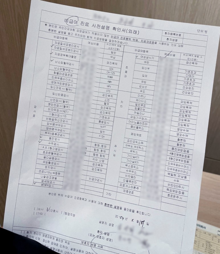 간호사 선생님과 예진하며 검사 할 항목들을 같이 체크한다. 나는 임신 전 산전 검사를 하러 왔다고 얘기했고, 간호사 선생님이 검사 가능한 항목들을 자세하게 설명 해주셨다. 검사 비용은 혹시 몰라 마스킹 처리했는데 전체 비용은 맨 아래에서 추가해뒀다.