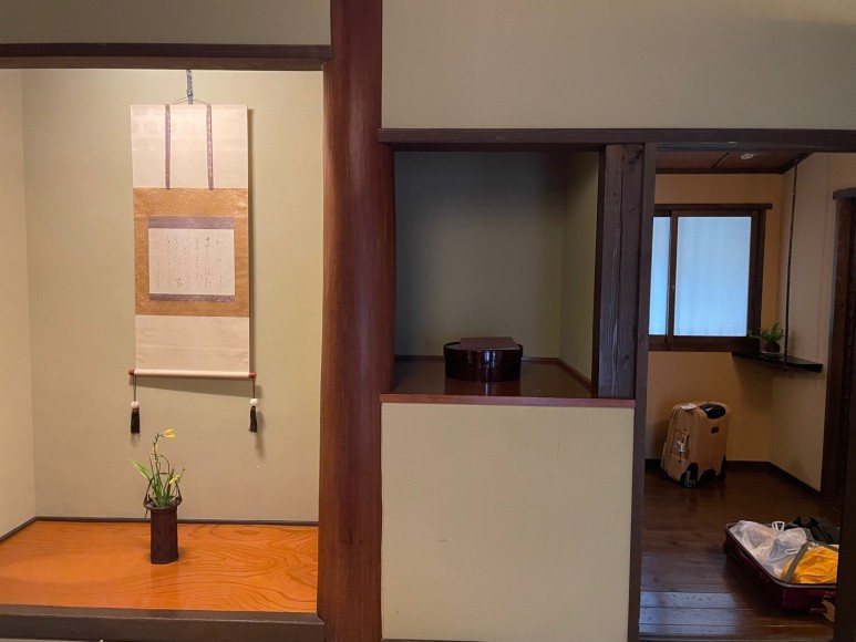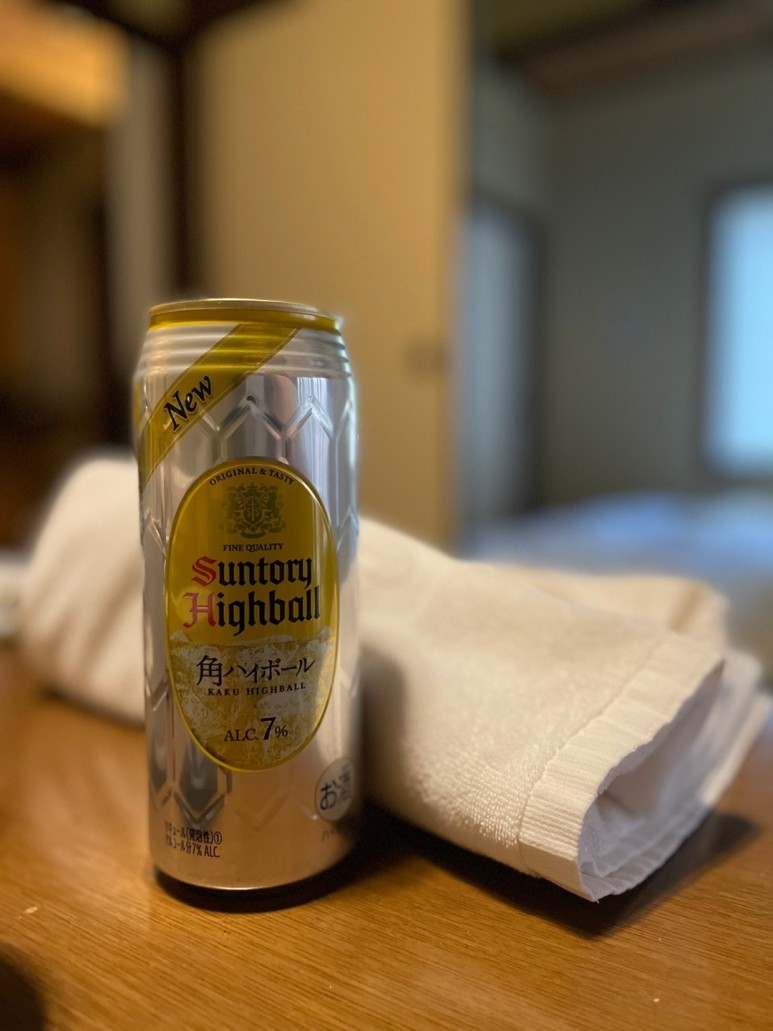 침실 미닫이 문을 경계로 다다미가 있는 거실로 이어진다. 나중에 설명하겠지만 포인트는 코타츠! 그 외 다과를 즐길 수 있는 다기들과 녹차가 준비되어 있다. 냉장고 안에 유자 양갱을 준비해줘서 숙소에 오자마자 까먹었다 (+ 맥주까지 전부 공짜다)