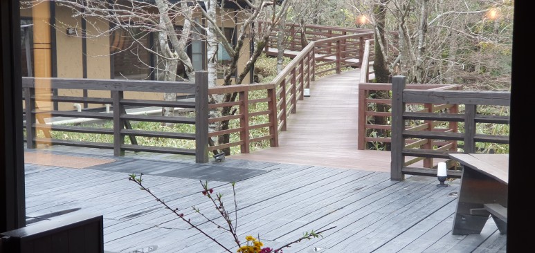 배정받은 숙소 가는길 다리를 건너면 별채로 연결이 된다. 당시 비 내린지 얼마 되지 않아 시원하면서도 깨끗한 공기가 느껴져 온천 들어가기 전인데도 너무 설렜다.