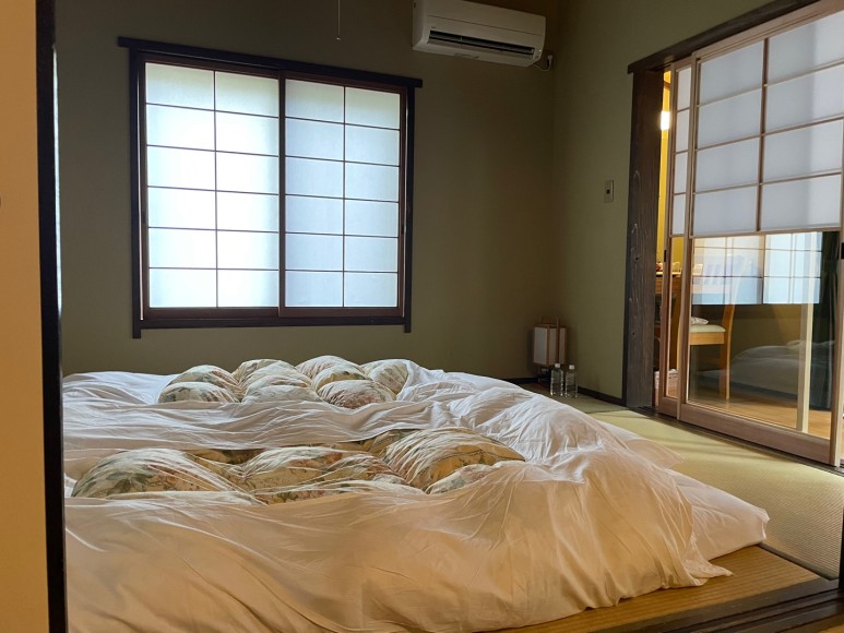 일단 거실/침실/프라이빗 료칸 구분이 아주 잘 되어 있어서 좋았다. 푹신푹신한 침구 2구가 깔려있었고 장롱을 열면 넉넉하게 이불이 준비되어 있다. 욕탕에서 나와 푹신한 이불에 누웠을 때 그 기분.. 정말 극락이다 ㅠ^ㅠ
