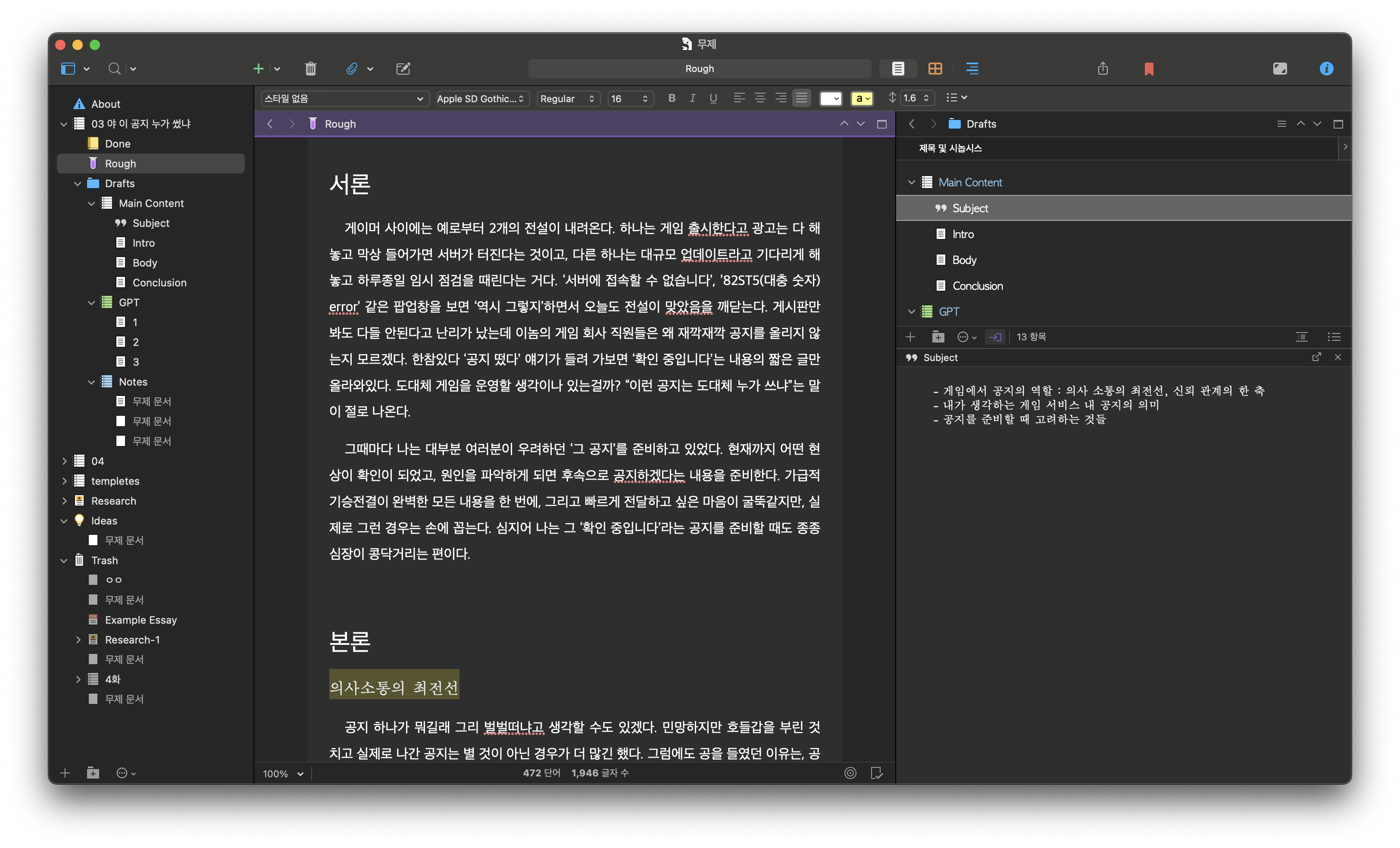 기본 화면은 시간에 따라 자동으로 화이트, 블랙으로 바뀐다. 스크리브너 기본 셋팅 그대로 놔뒀다. 본문 셋팅은 고딕체로 16pt, 글 간격은 1.6pt로 두고 쓰고 있다. 서론/본론/결론은 제목 스타일, 소제목은 헤드1 스타일, 본문은 스타일 없음으로 두고 쓰고 있다.