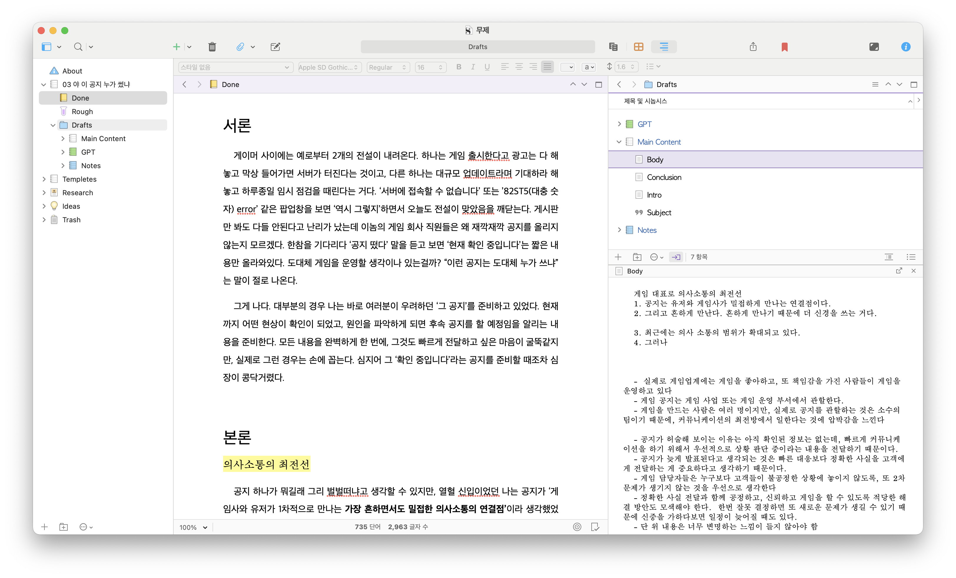 각 항목들은 누르면 가운데 화면에 바로 뜬다. 나는 Rough와 Done만 가운데에 두는 편이고 나머지는 오른쪽 상하단에서 확인하고 있다. 저 Templetes가 글 1편에 대한 셋트라고 보면 되고 템플릿에 오른쪽 버튼을 눌러 복제해서 다음 글을 쓰면 된다. Templetes를 무한히 늘려서 글을 쓸 수 있기 때문에 저 파일은 작품 단위로 사용한다.
