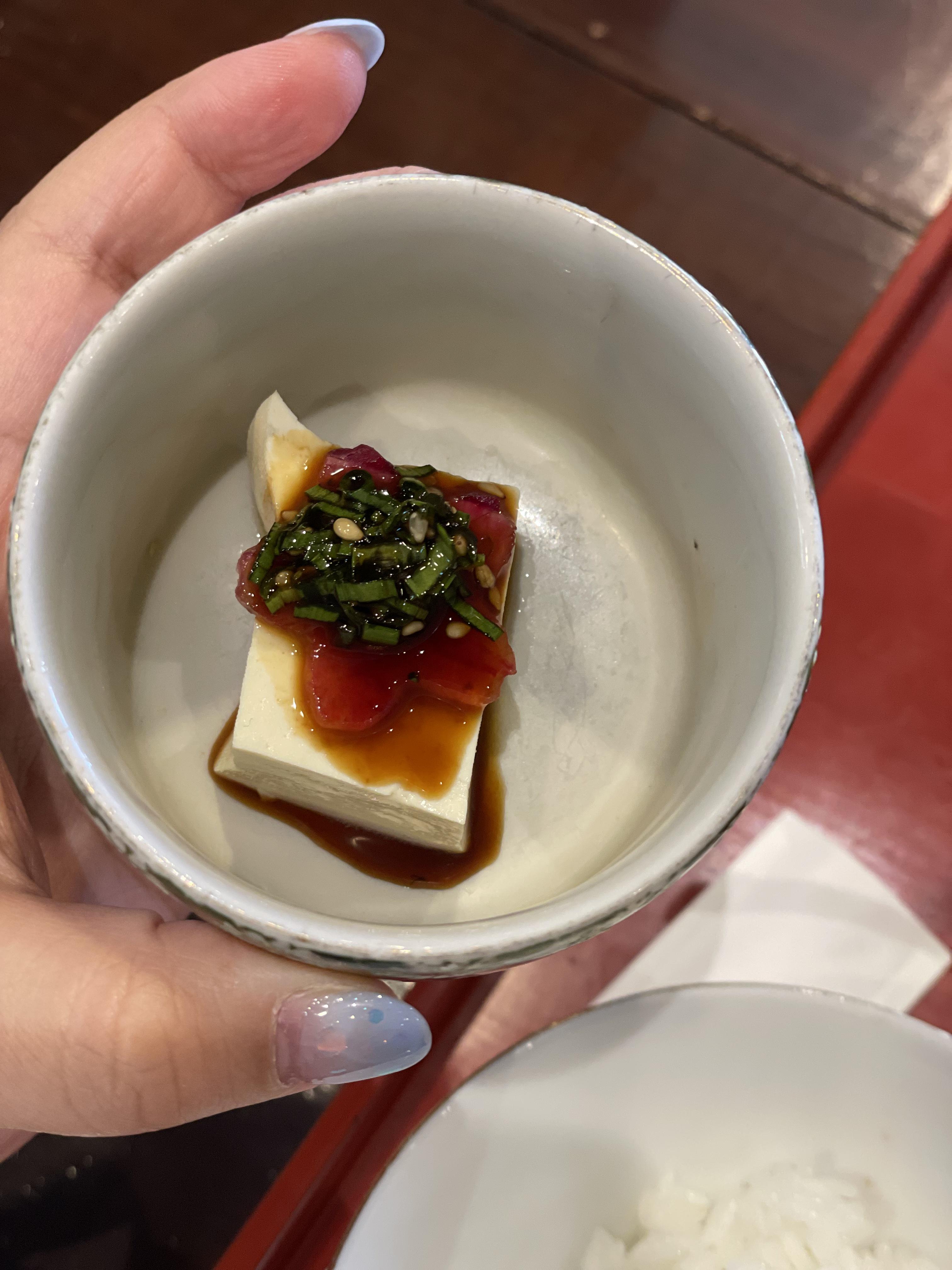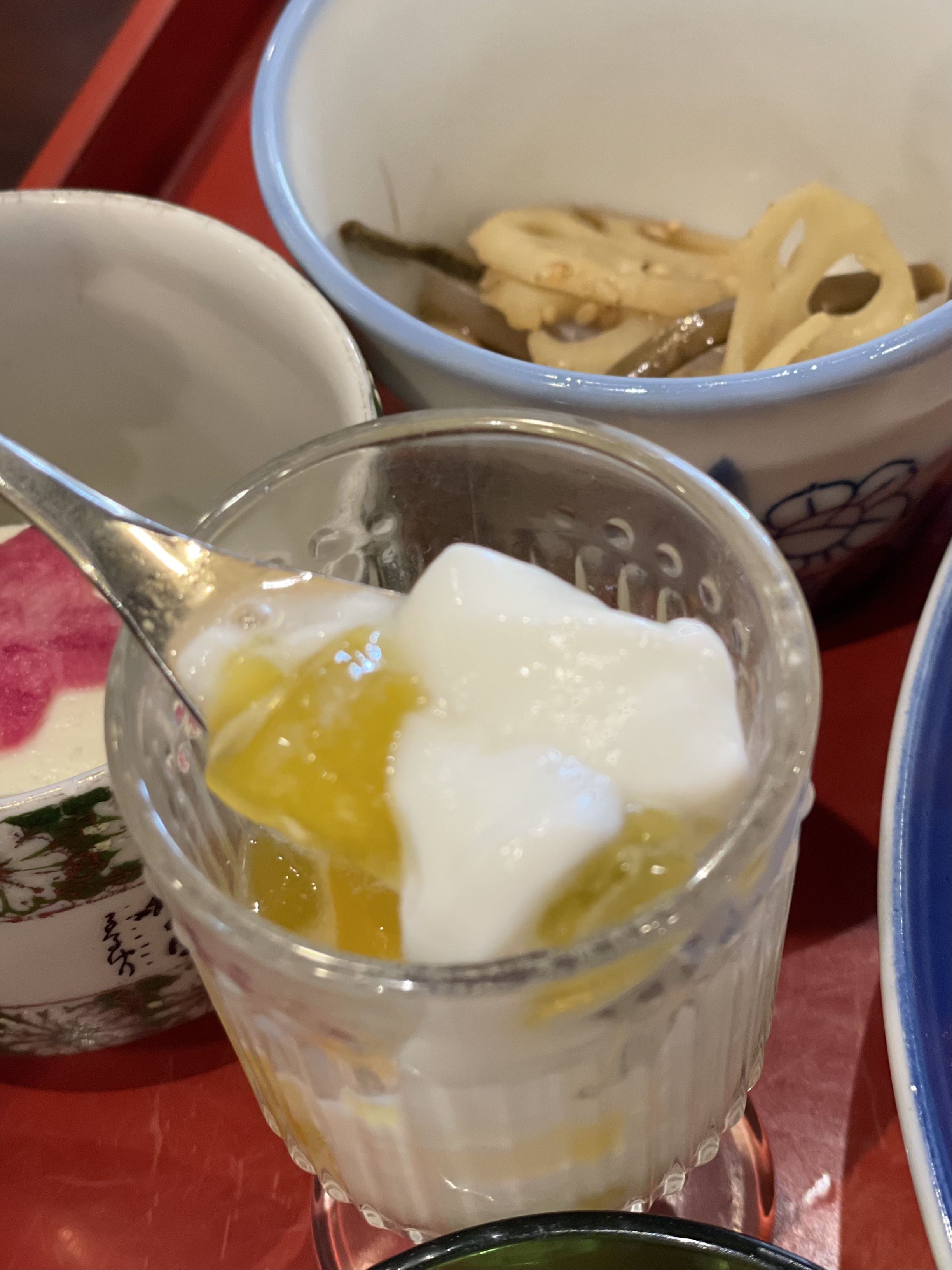 마무리로 먹는 두부와 우유 푸딩?까지. 연근과 배추 절임도 맛있어서 싹싹 긁어 먹었다고 한다.