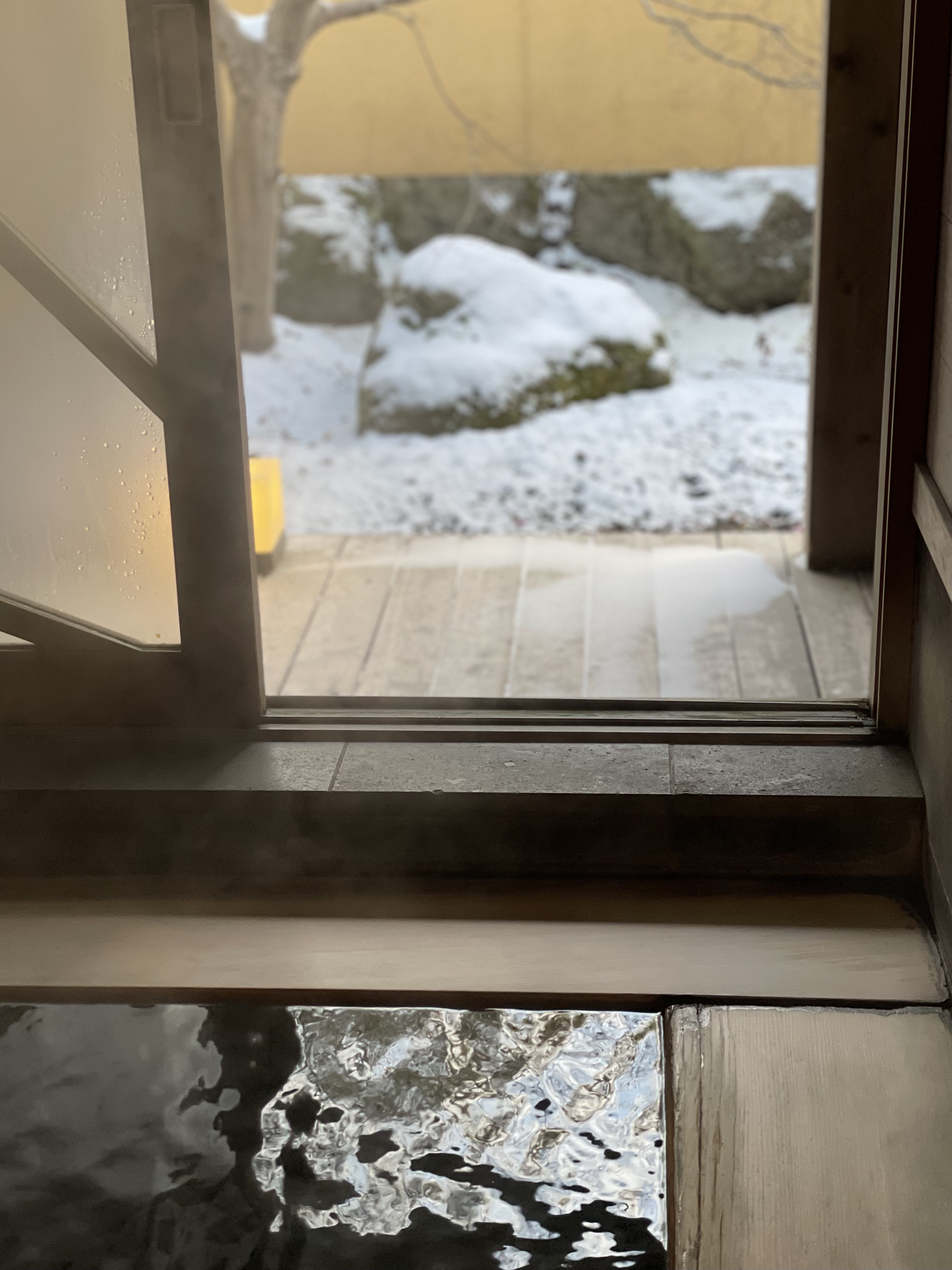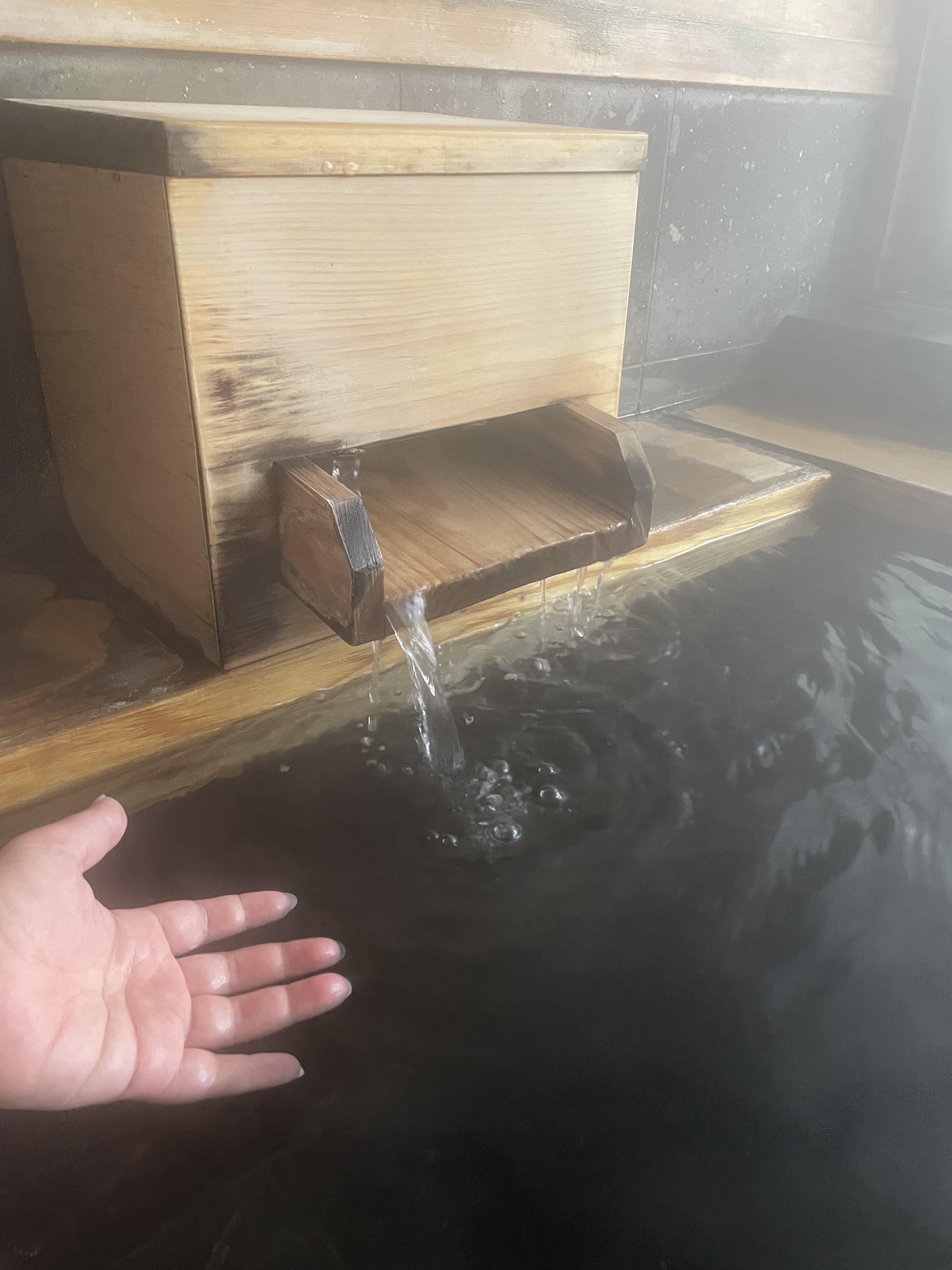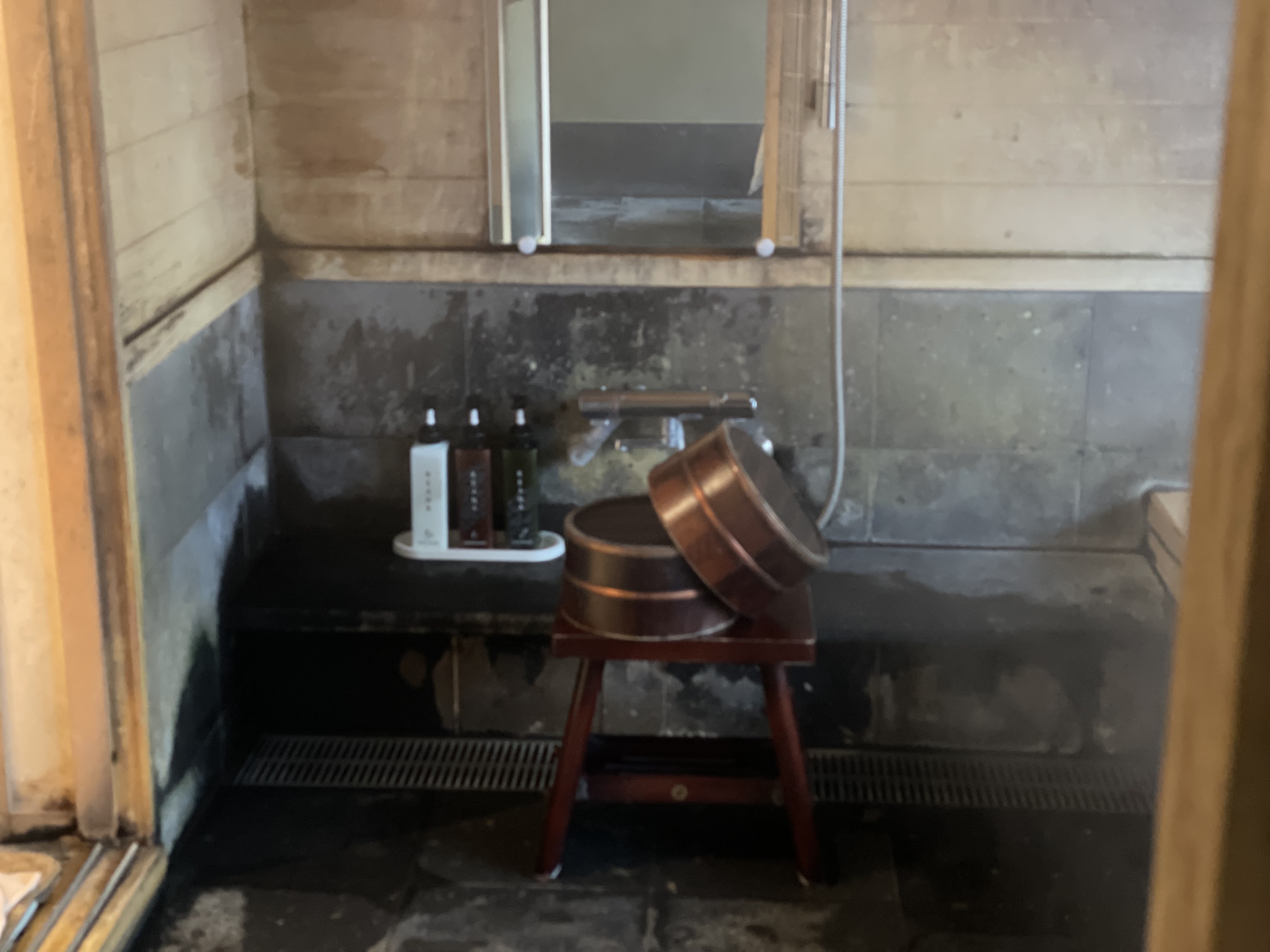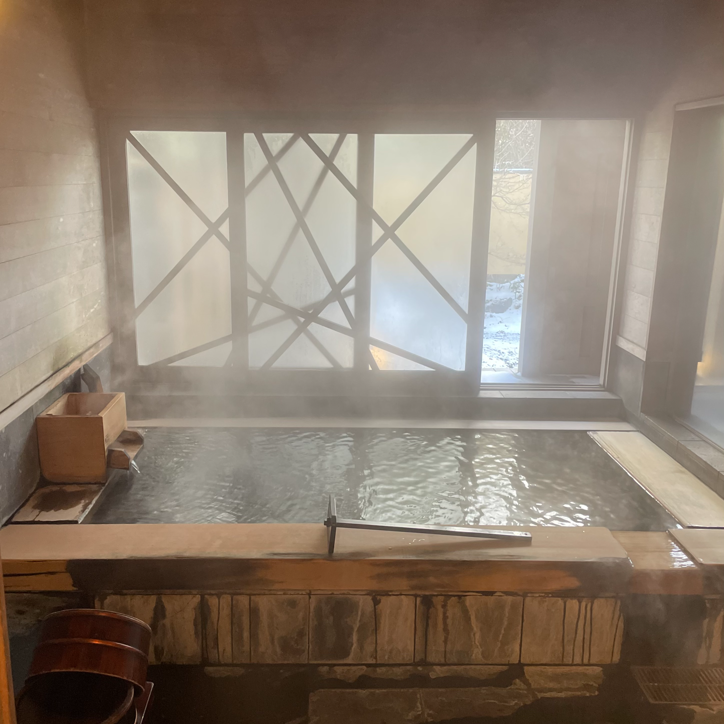 세면 공간을 지나오면 온천에 들어가기 전에 몸을 씻을 수 있는 공간이 있고, 바로 실내 온천탕으로 이어진다. 남녀 둘이서 발을 쭉 뻗어도 공간이 남을 정도로 공간이 크고, 창문을 열면 바깥 공기가 들어와서 노천의 느낌도 받을 수 있다. 물은 밤새도록 계속 흘러나오도록 두면 된다.