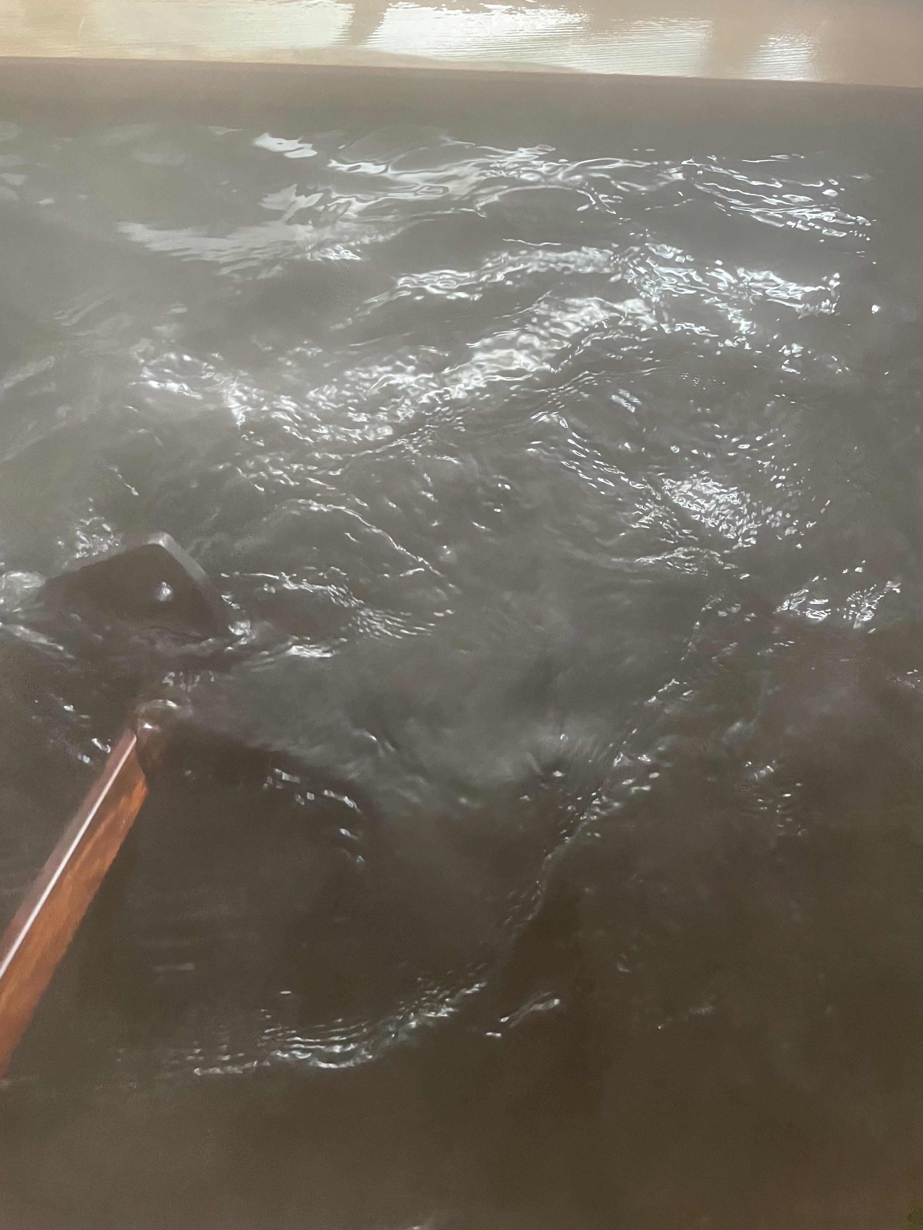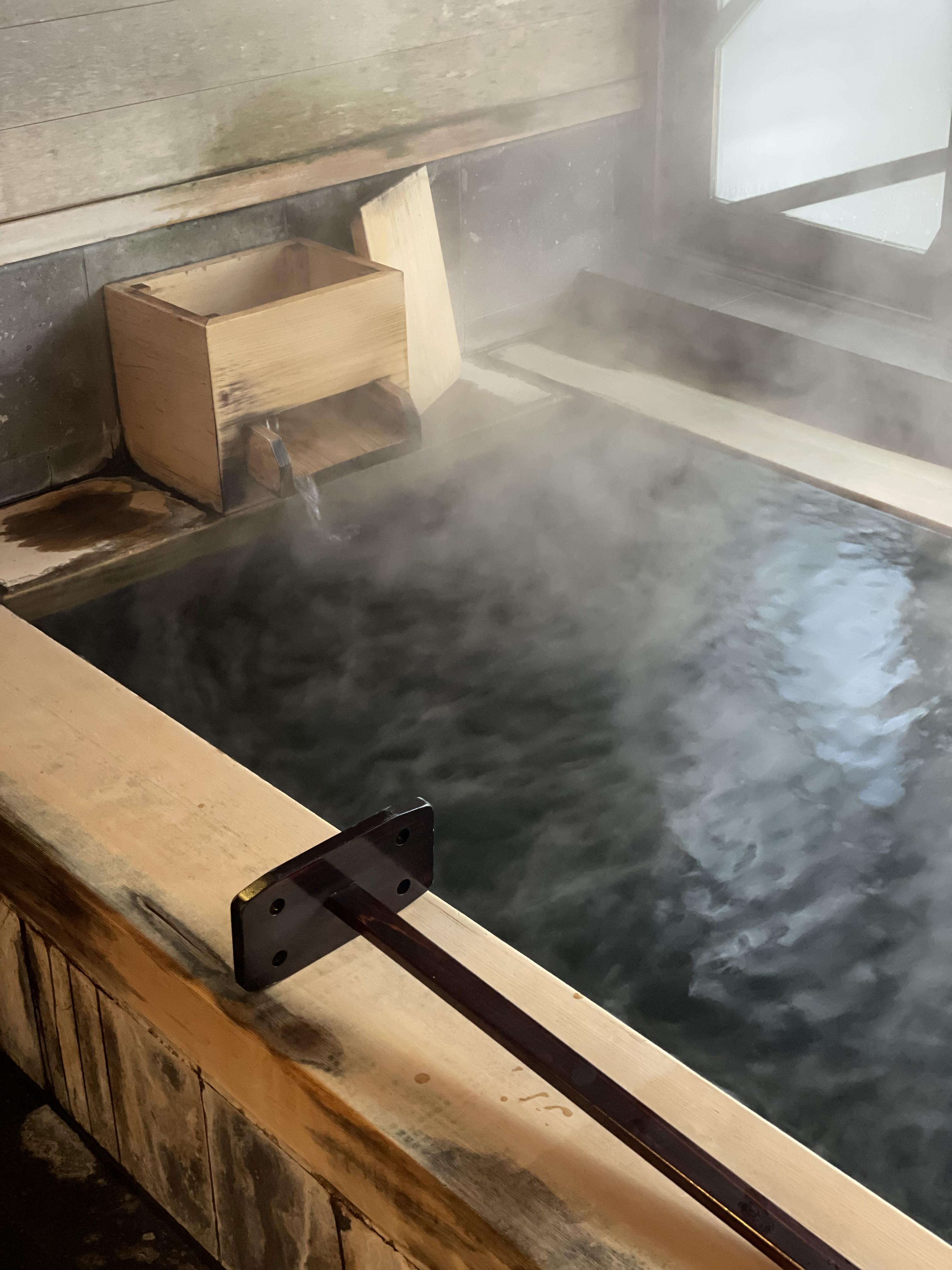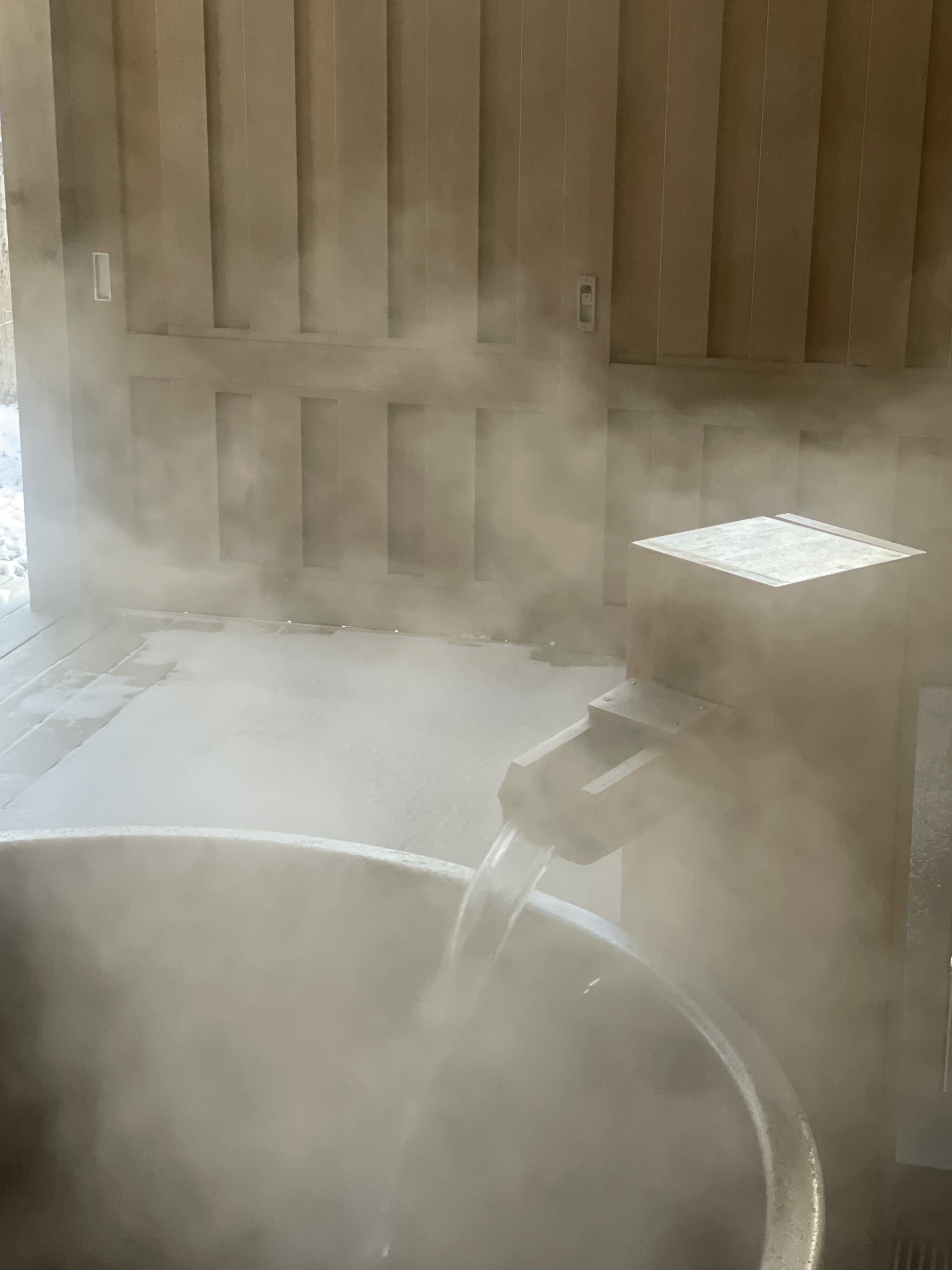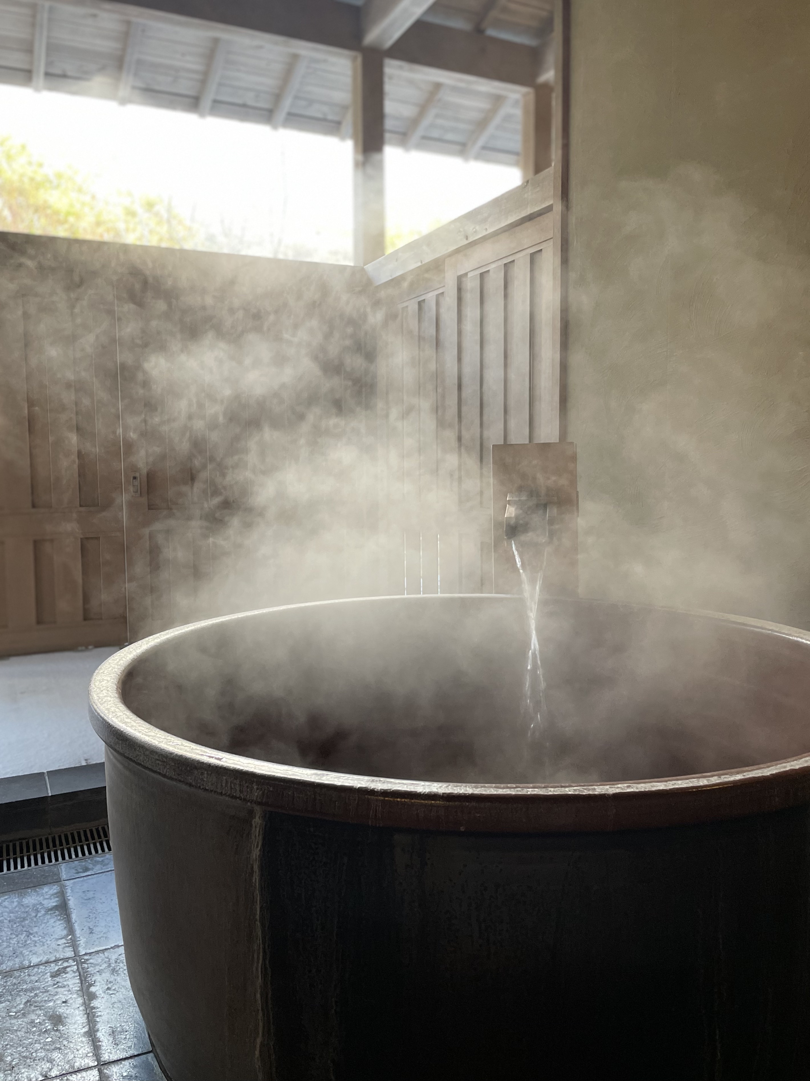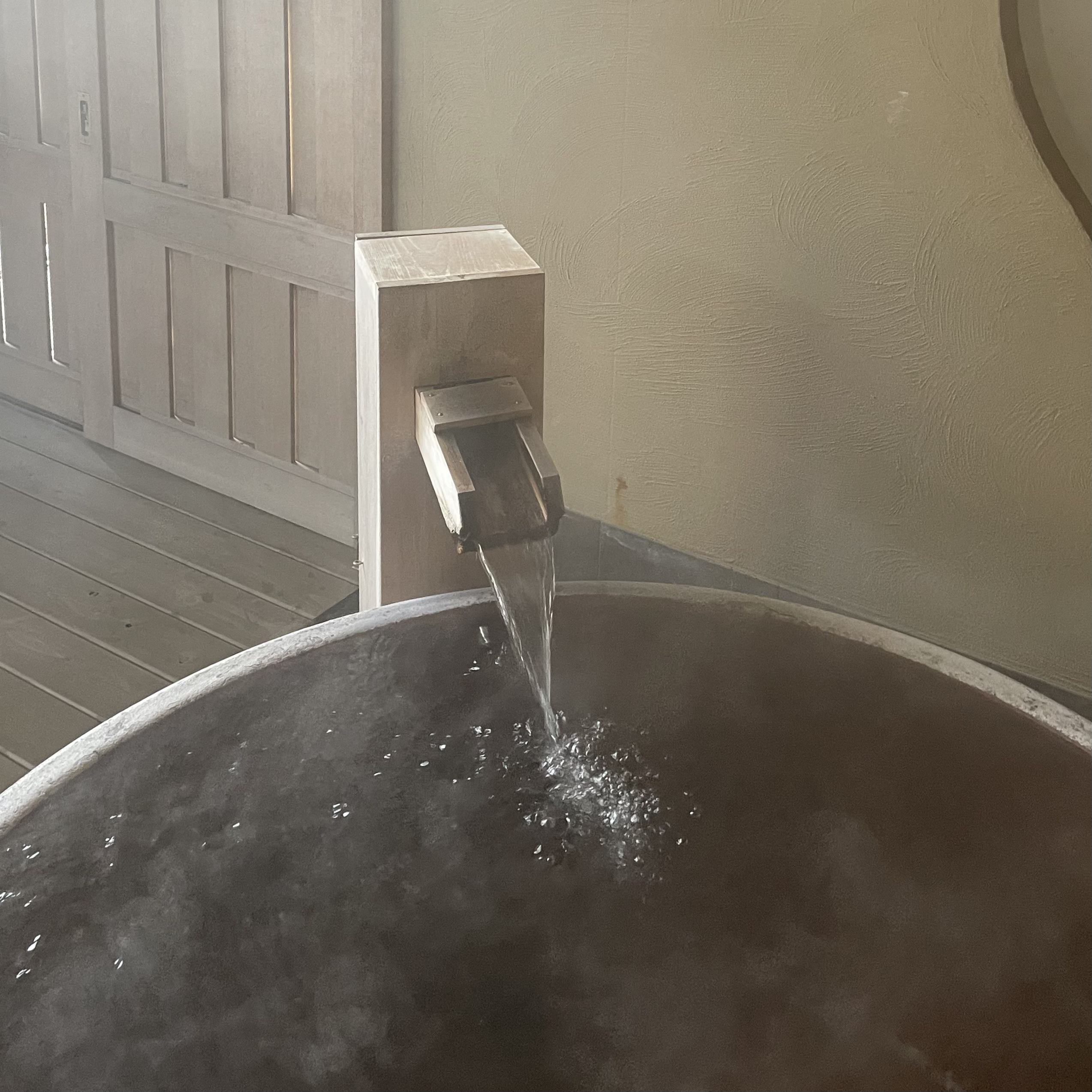 세면 공간을 지나오면 온천에 들어가기 전에 몸을 씻을 수 있는 공간이 있고, 바로 실내 온천탕으로 이어진다. 남녀 둘이서 발을 쭉 뻗어도 공간이 남을 정도로 공간이 크고, 창문을 열면 바깥 공기가 들어와서 노천의 느낌도 받을 수 있다. 물은 밤새도록 계속 흘러나오도록 두면 된다.