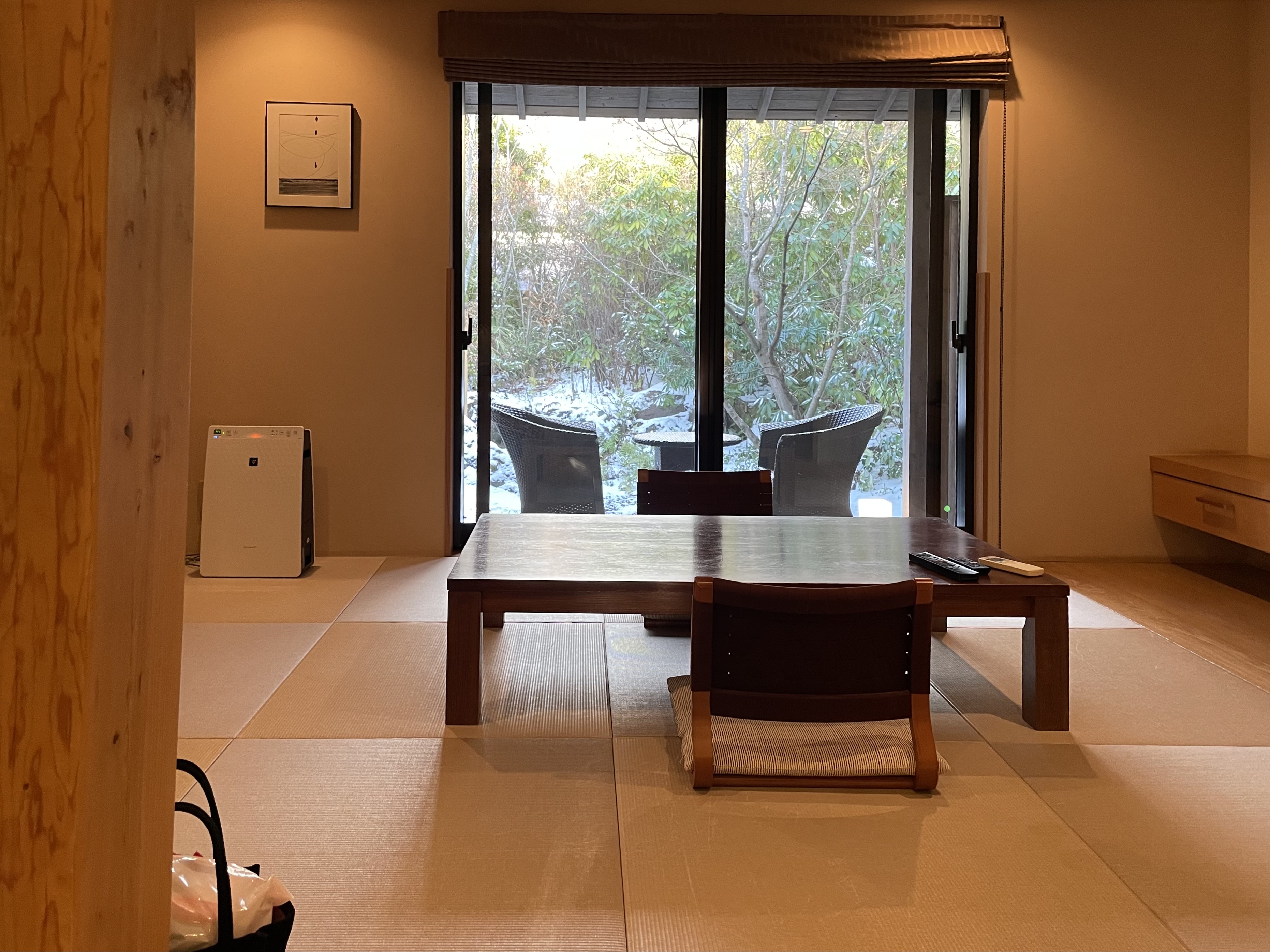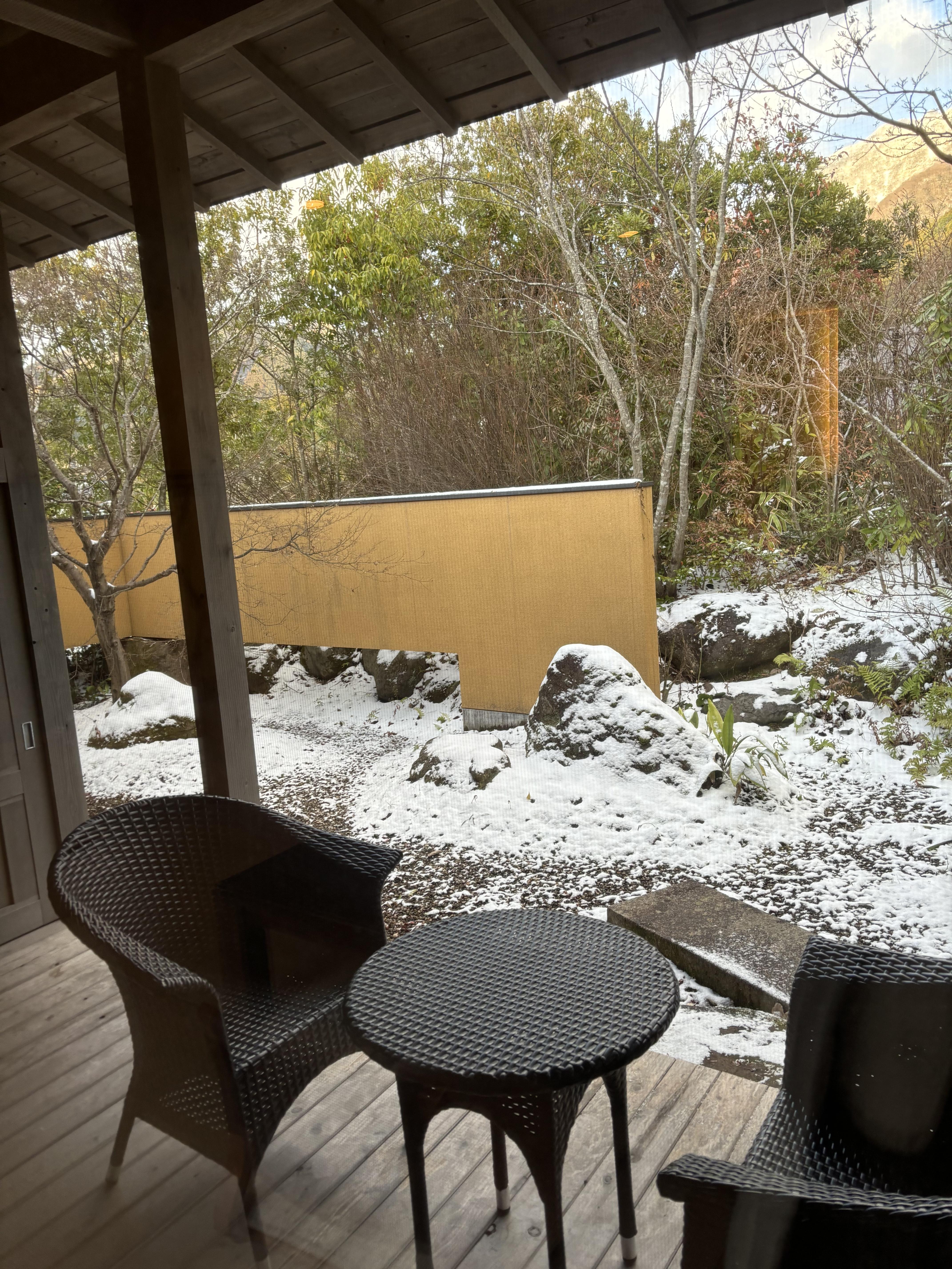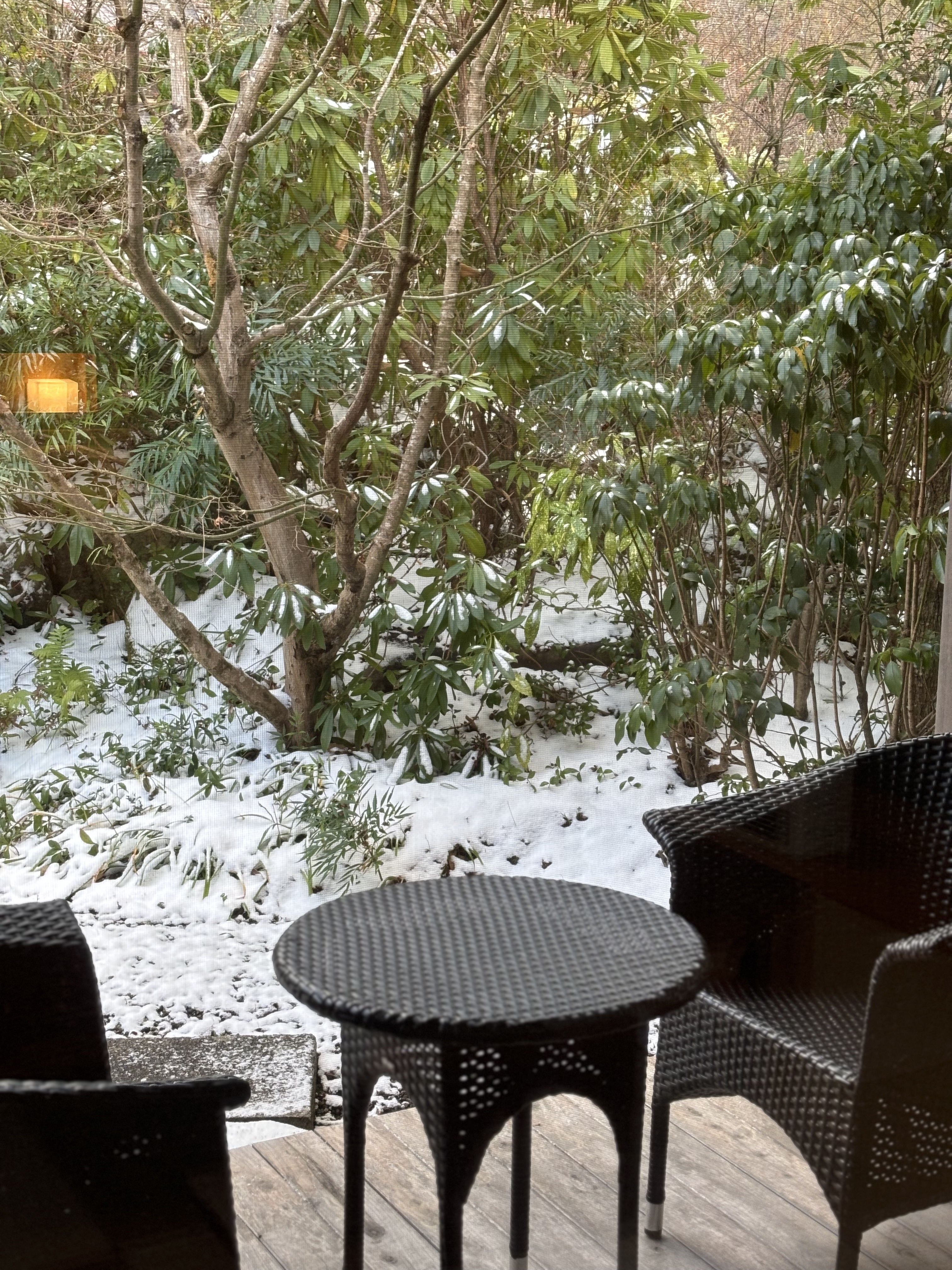 거실 바깥에는 자연을 보며 즐길 수 있는 테라스가, 또 노천탕을 바라 볼 수 있는 창문도 있다. 테라스 너머에는 아주 아담한 돌 정원이 있는데 봄에 와도 너무 좋을 것 같았다.