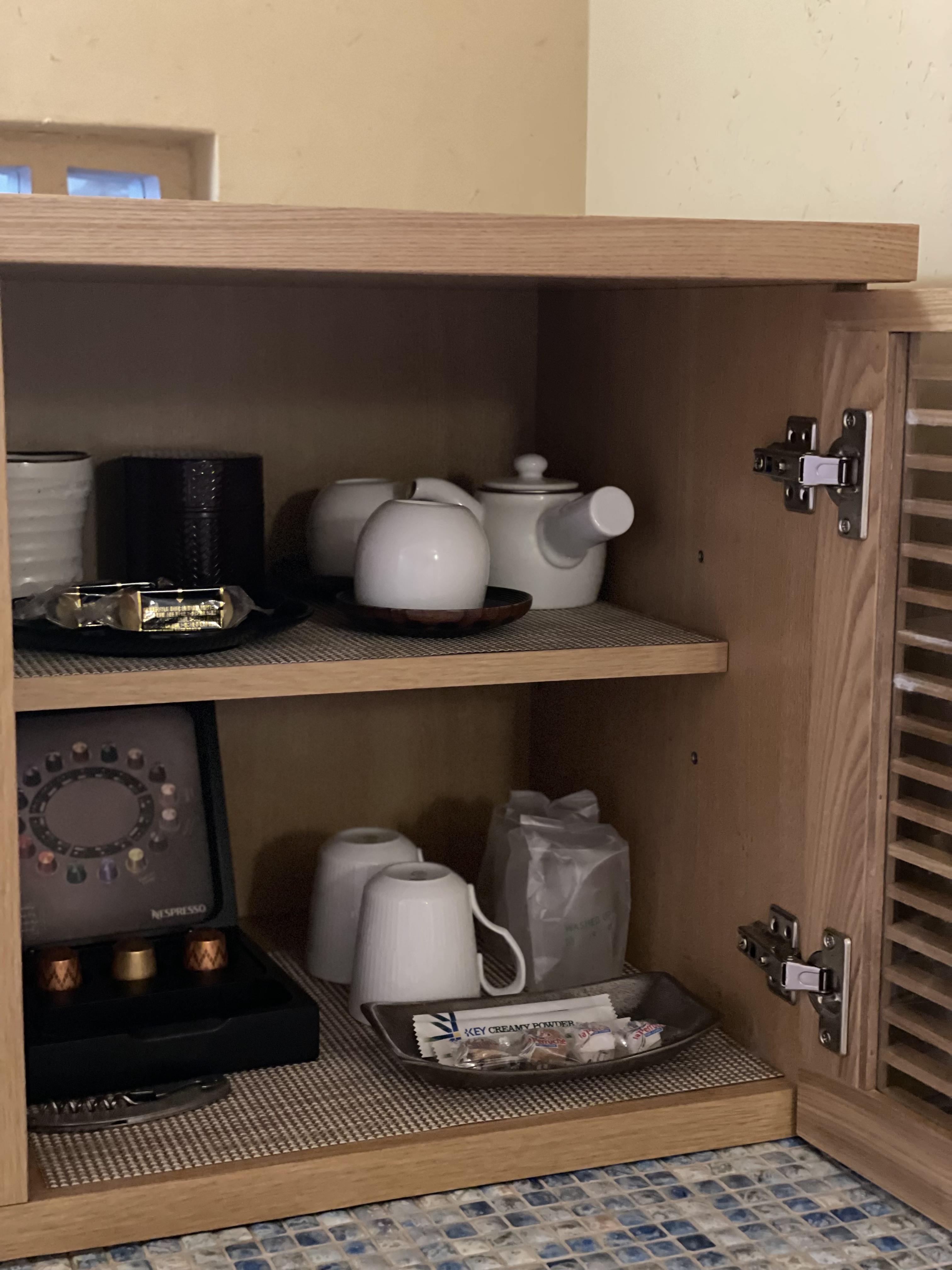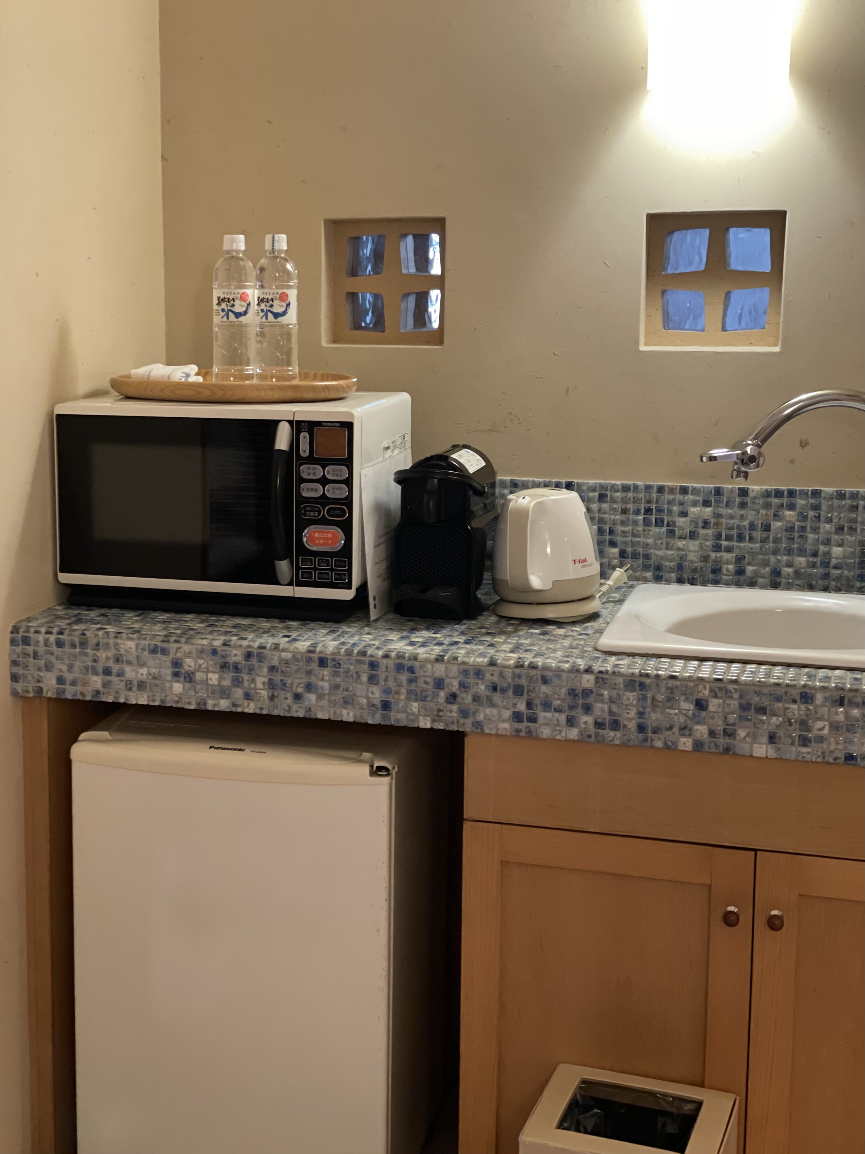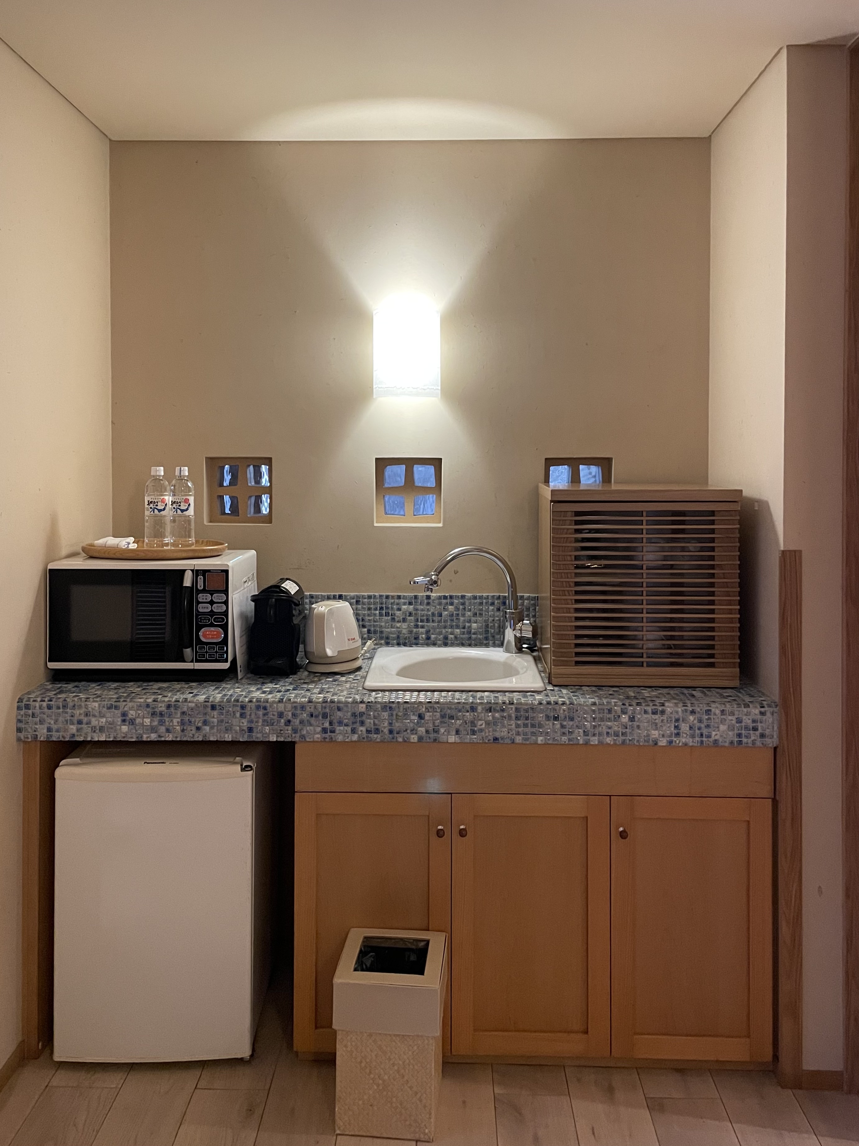 들어오자마자 음식 보관과 간단한 다과를 할 수 있는 주방 공간이 있다. 좋았던 점은 전자레인지가 각 객실마다 비치가 되어있다는 점, 그리고 네스프레소 커피 머신이 있어서 커피를 내려 먹을 수 있다는 점이었다. 그리고 먹진 못했지만, 유후인 기념품으로도 파는 간식도 비치되어 있다.