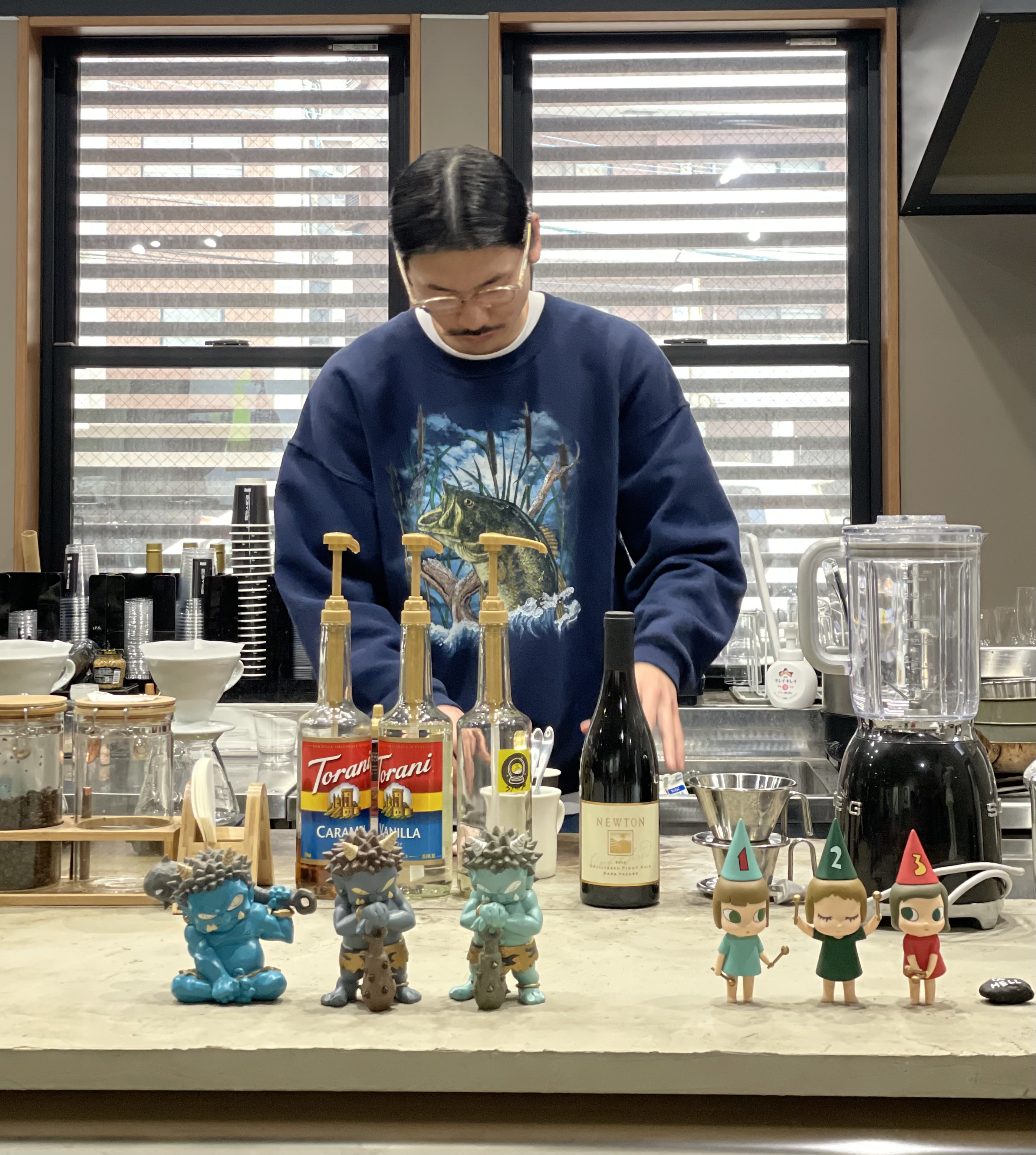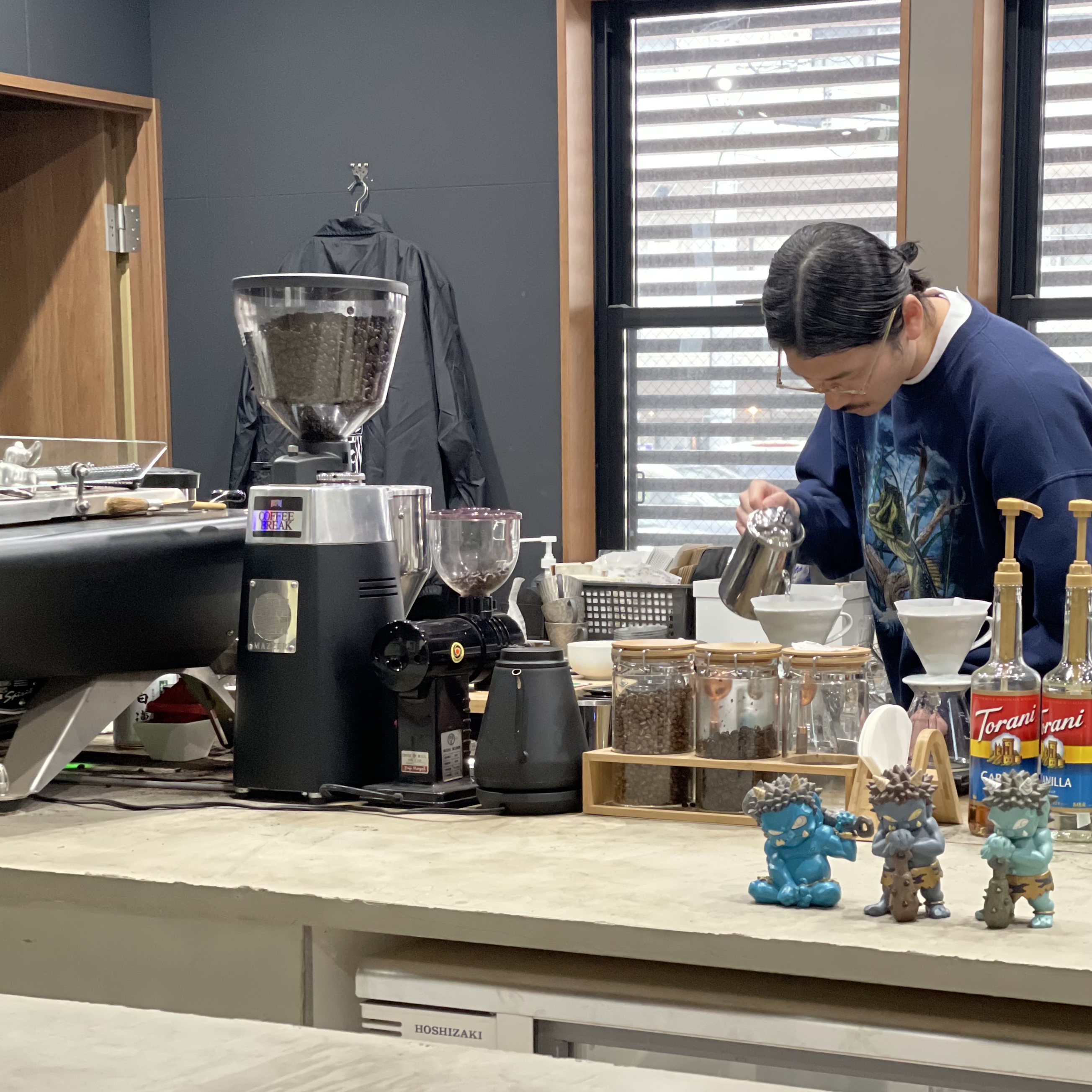 하카타역의 gold flog coffee의 사장님이다. 갤러리 형태의 카페인데, 갤러리 컨셉을 유지하기 위해 테이블을 중간에만 덩그러니 뒀다. 그래서 사장 입장에선 공간 효율이 꽝이다. 그런데도 그렇게 했다. 여긴 갤러리 컨셉 카페니까! 그리고 아기자기한 스티커들도 카운터에 붙어있다. 사실 이 공간은 사장님의 외형이 다 한 곳이긴 하다.