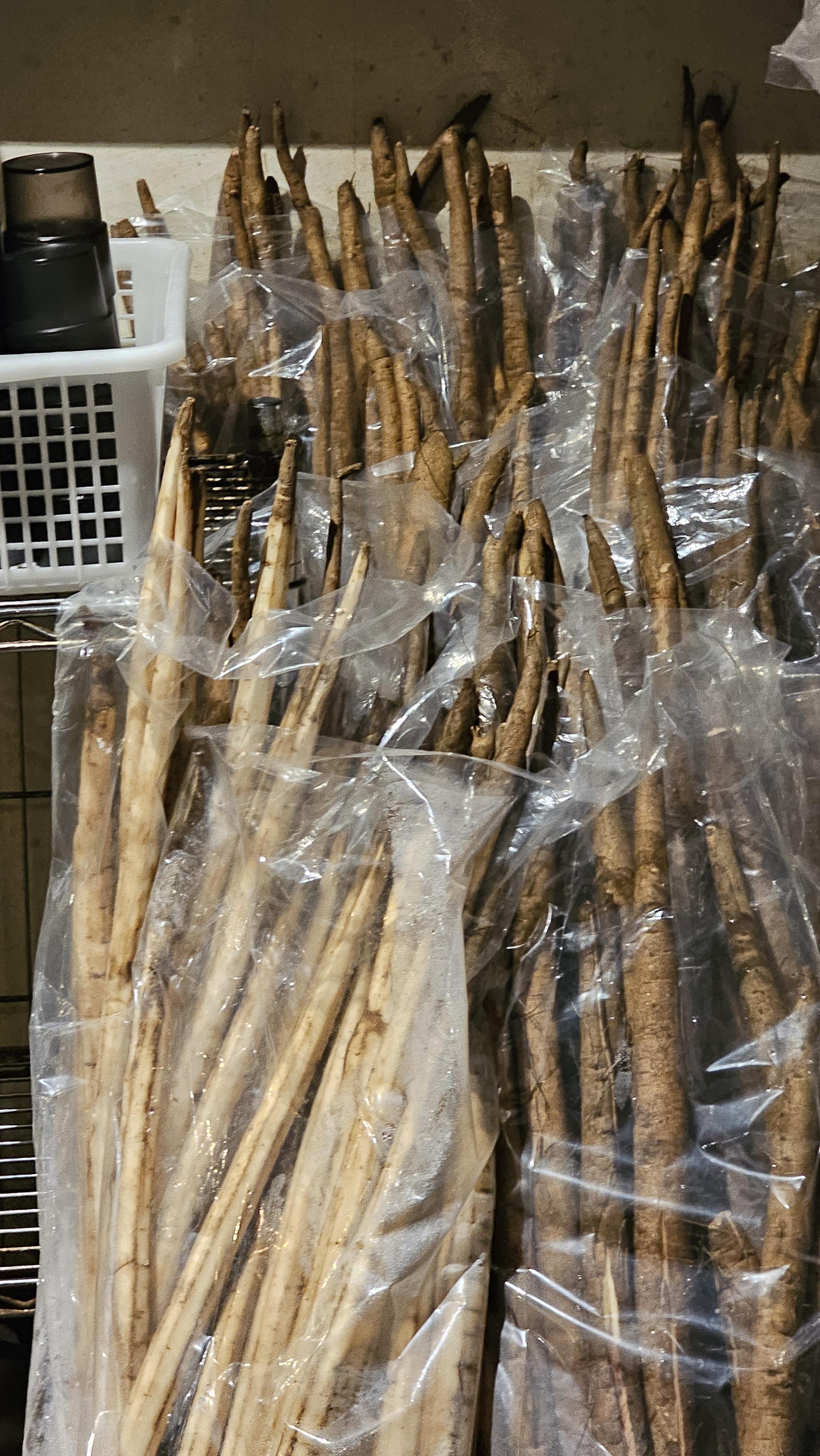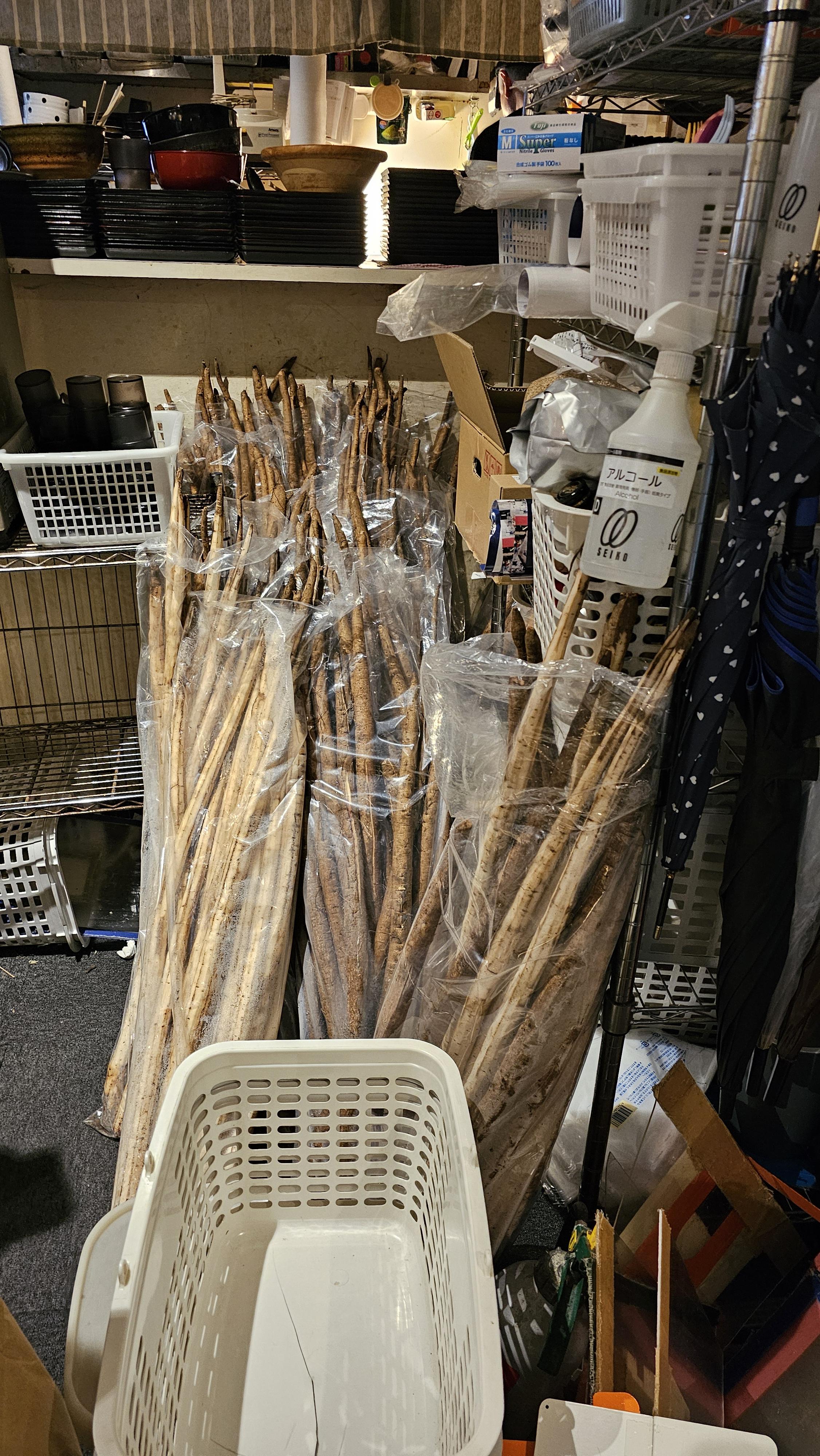 기다리는 줄에 이렇게 우엉이 쌩으로 쌓여있다. 저걸 하나하나 껍질을 깐 뒤에 튀긴다는 거잖아..? 밤 껍질 까주는 기계처럼 이것도 그런 기계가 있는지는 모르겠지만, 저 많은 우엉을 사람들이 다 먹는구나 싶었다.