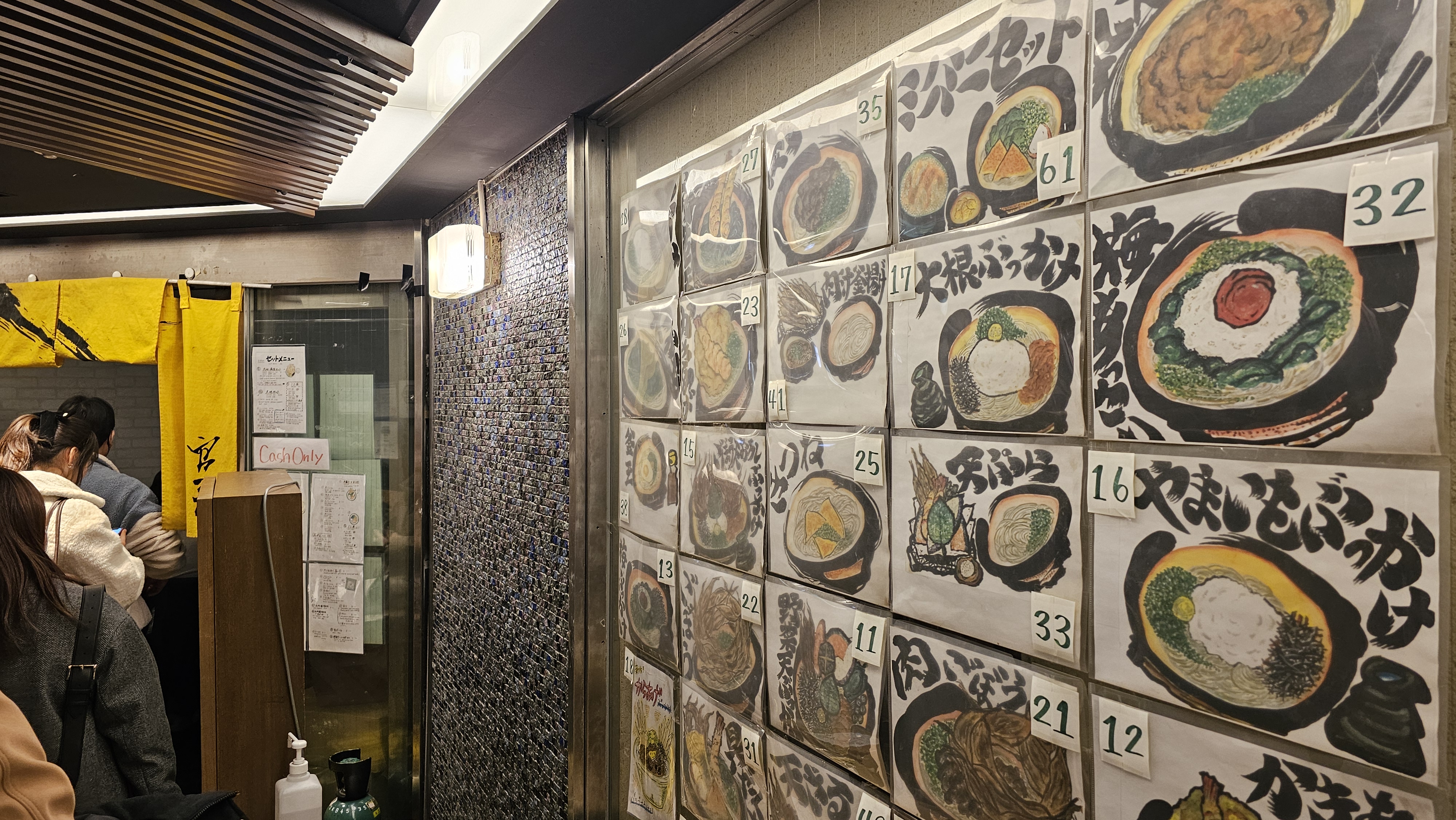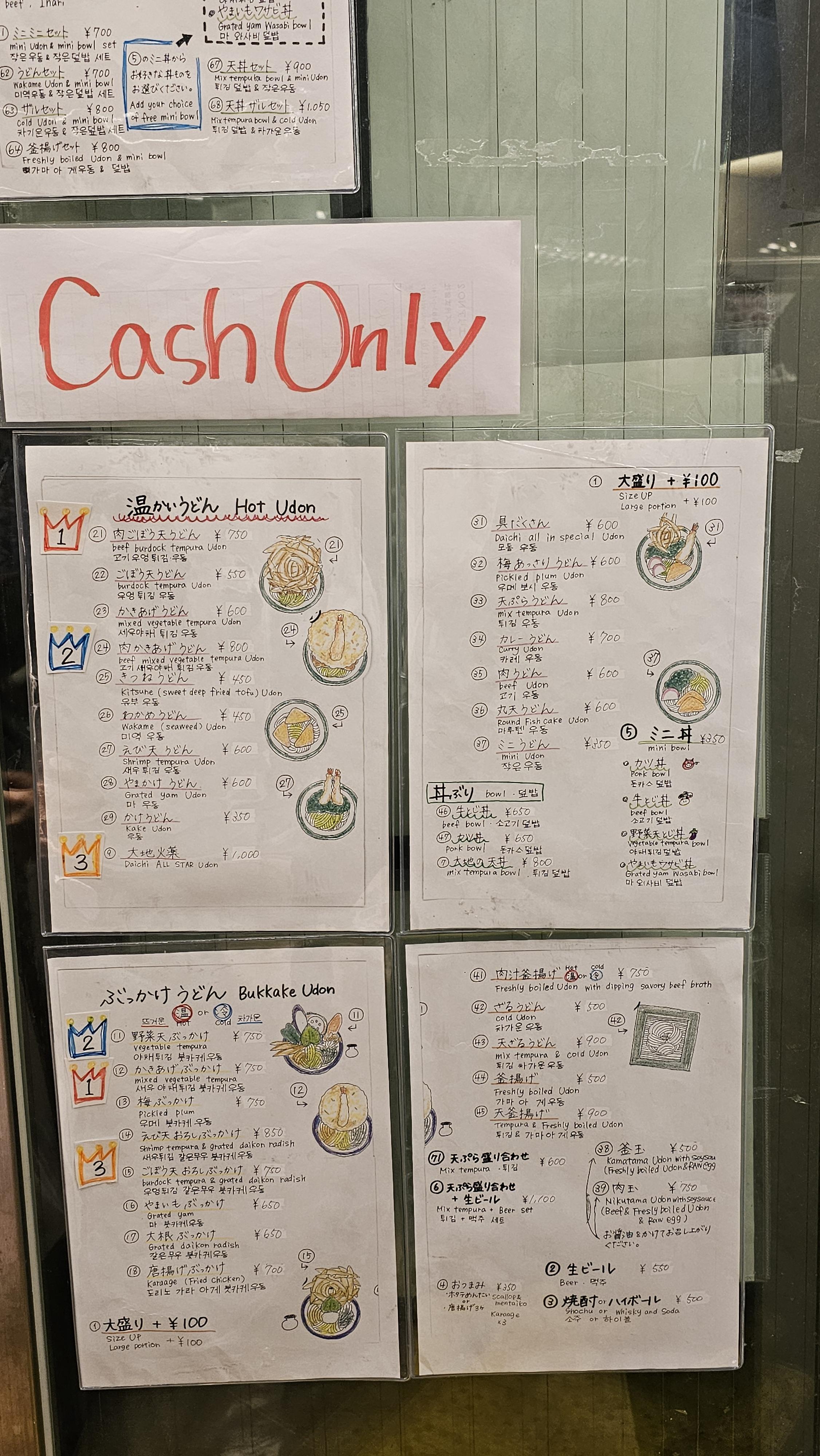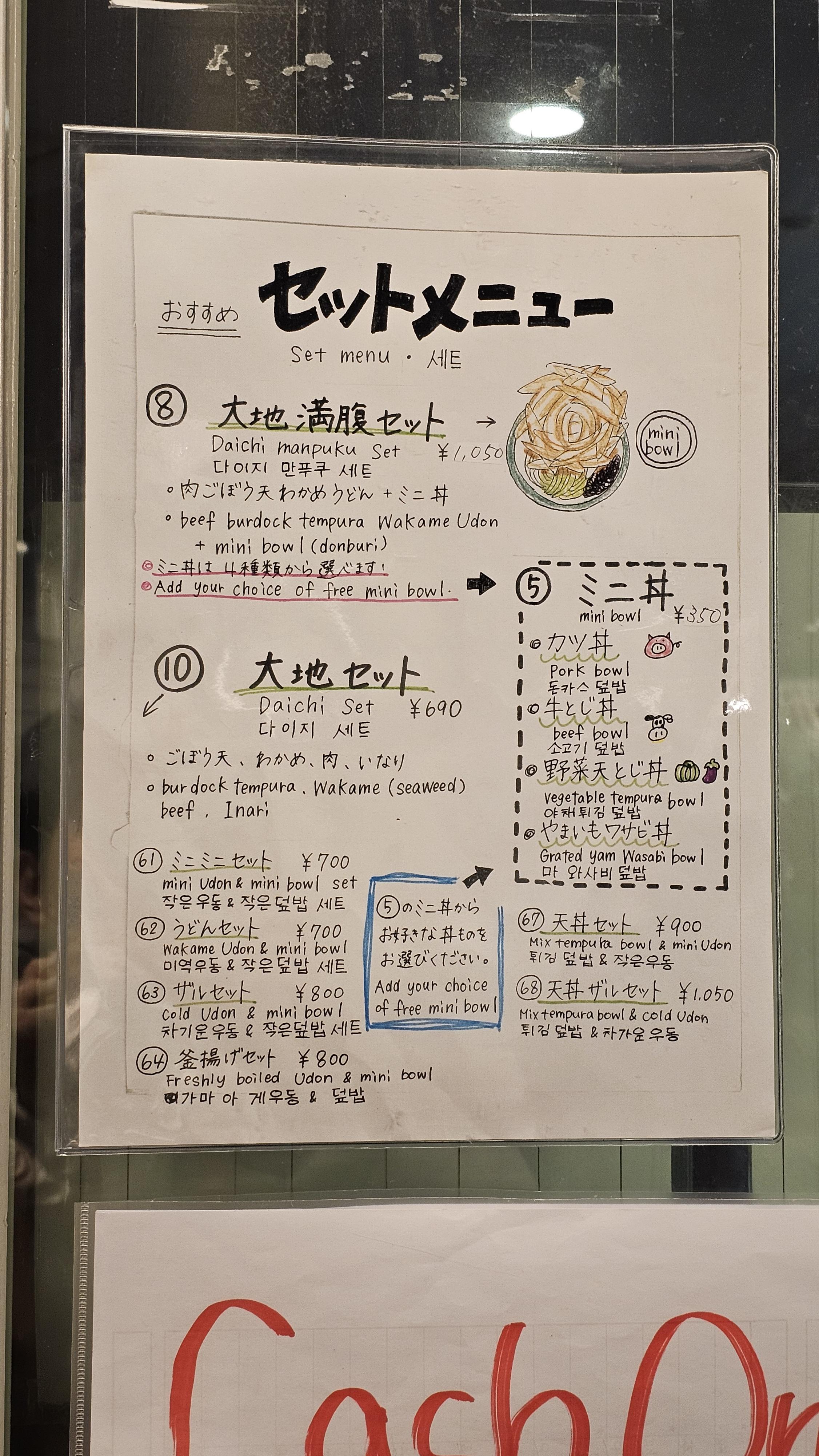 한국어 패치되어서 한국어 메뉴가 있다. 나는 붓가케 러버라서 갈은 무우 붓가케를 먹기로 했고, 동글이는 시그니처인 고기 우엉 튀김 우동을 먹기로 했다. 둘다 왕관 그려져있는 거 보면 맛있겠지 뭐!