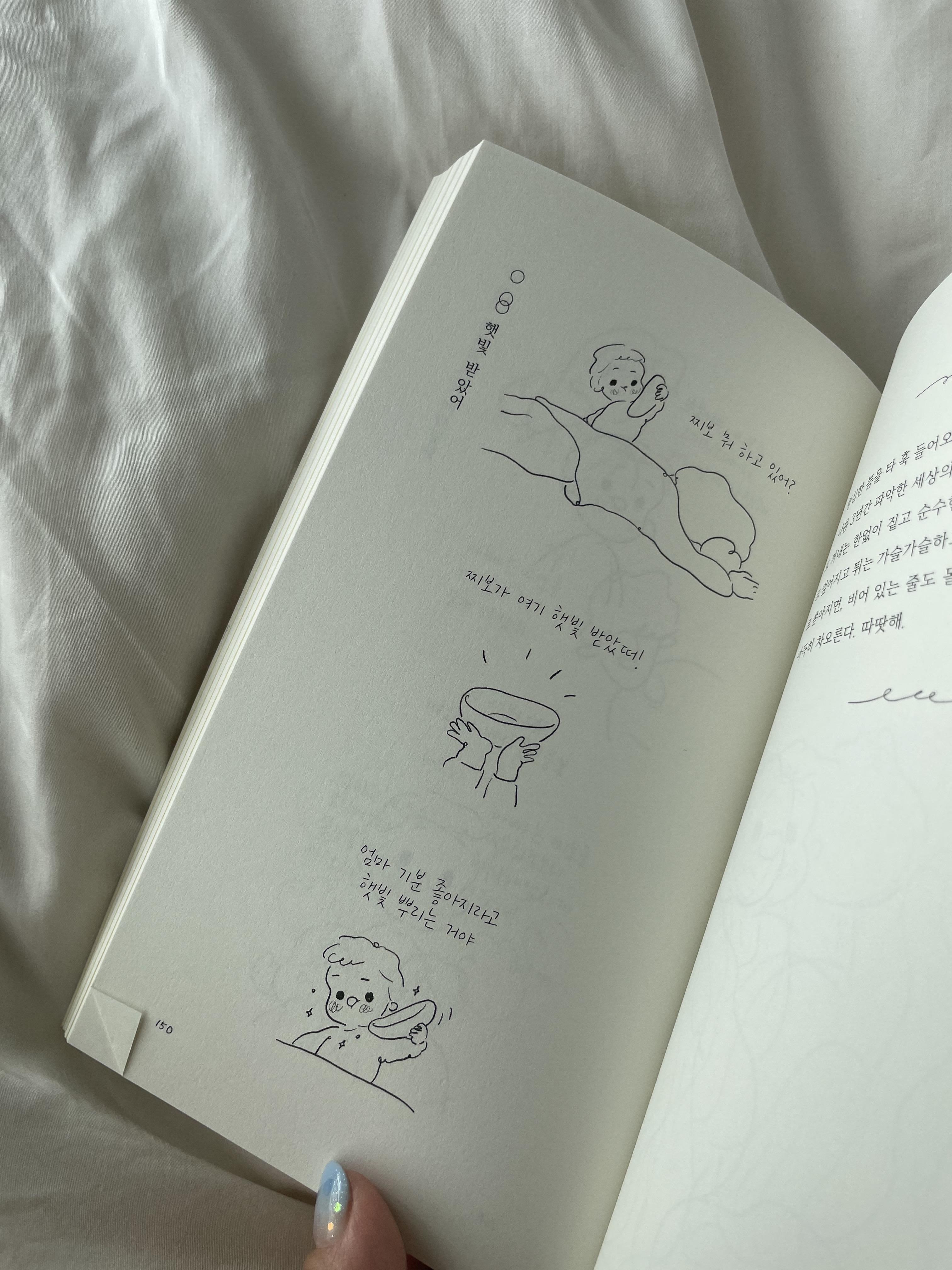책에는 고되고 지난한 육아 속에서 채를 떠 걸러 낸, 햇살 가득한 이야기들이 담겨 있다. 지나가기만을 바라던 시간들이지만, 그 속에서도 눈부신 햇살 같은 순간이 있었기에 잊지 않기 위해 기록했다. 호락호락하지 않은 삶이기에 음미했을 때 더 빛나는 이야기들이 있다. 책은 일러스트가 메인이지만 아이를 대하는 마음, 엄마로서의 책임감, 힘들지만 다시 돌아오지 않을 시간에 대한 메시지가 책 곳곳에 스며있다. 가벼운 주제지만, 작가가 만들어낸 시간은 결코 가볍지 않기에 오히려 빨려가듯 읽었다.