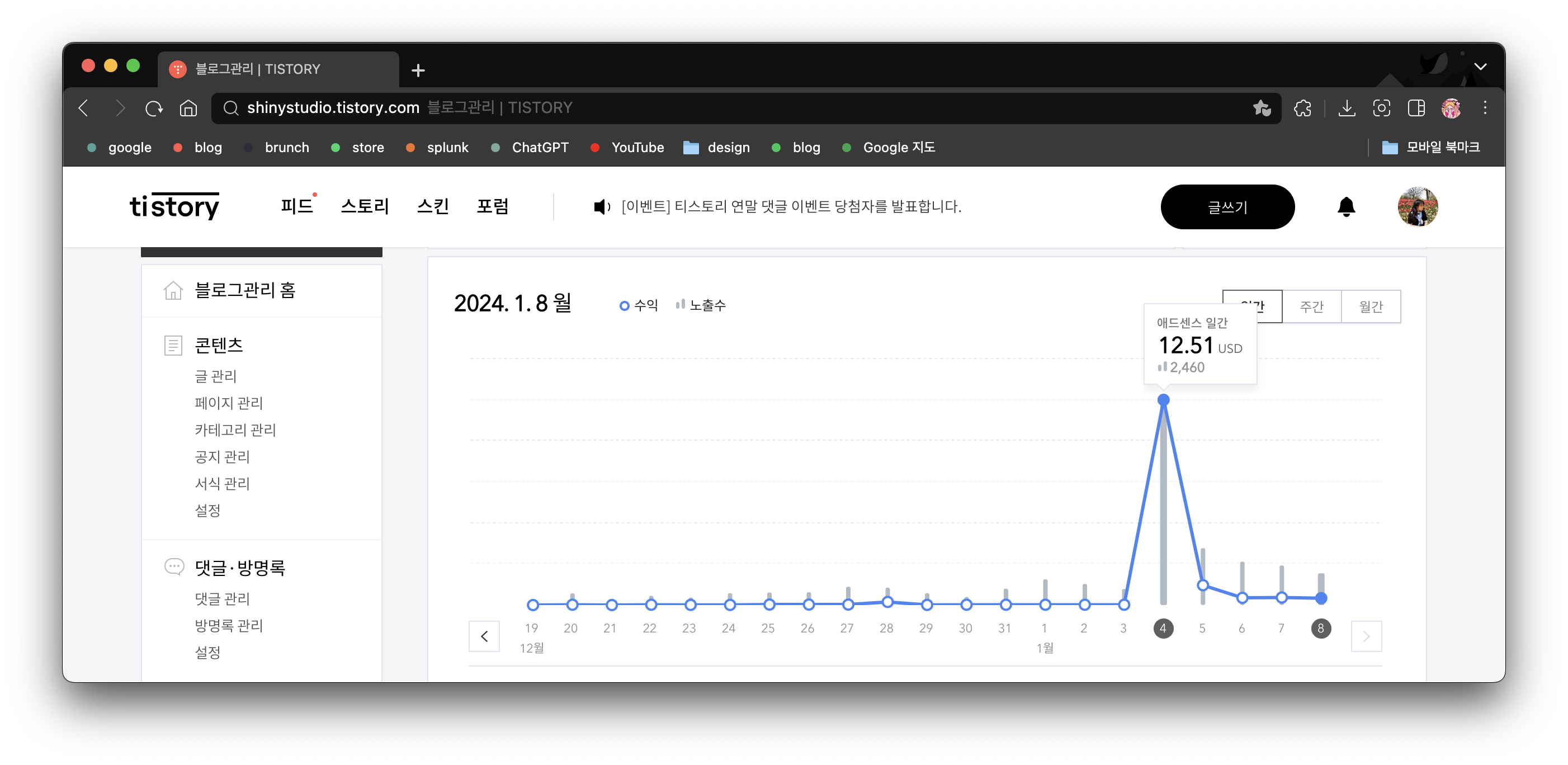 어제 소개 이후 블로그 수익이 엄청나게 올랐다! 다시 내려갔지만, 도달 수에 따라 수익이 급격하게 증가하는건가? 싶었다. 작년엔 크몽에서 템플릿 1개로 40만원을 벌었었다. 크몽에서 야금야금, 블로그에서 야금야금, 유튜브 야금야금, 광고 야금야금, 스토어 야금야금하면 그럭저럭 괜찮은 부수입이 되지 않을까? (근데 아직 시작안함) 분유 값, 기저귀 값 정도 커버될 정도로만 운영이 되면 좋겠다.