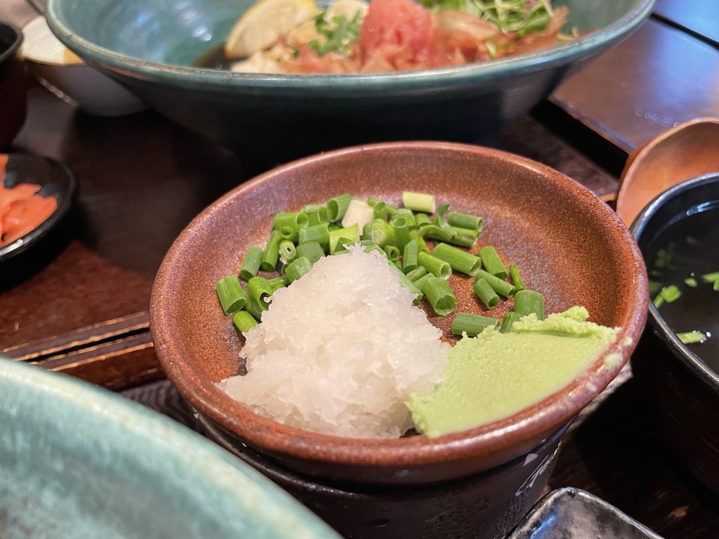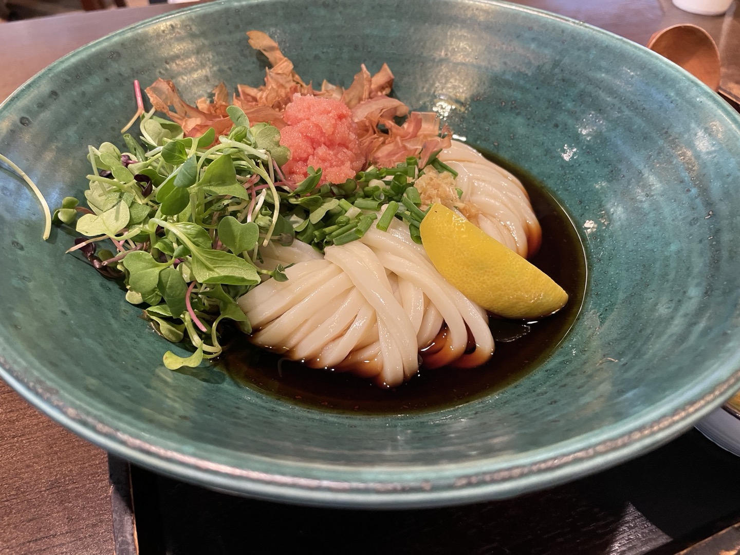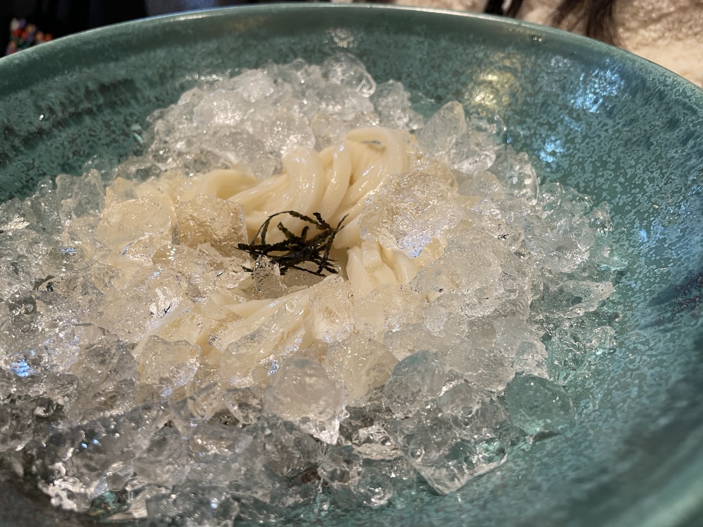 자루는 차가운 얼음 면을 육수에 적셔서 먹는 우동이다. 무와 쪽파를 육수에 넣어서 새콤달콤하게 만든 뒤 탱글탱글한 면발 그대로 넣어서 호로록 한가닥씩 먹으면 된다. 면 두께가 생각보다 두꺼워서 한두가닥씩 먹게 된다. (나만 그럴수도?) 우동을 다 먹기까지도 얼음이 남아있을 정도로 시원하게 차려줘서 면의 탱글탱글함을 유지시켜준다.