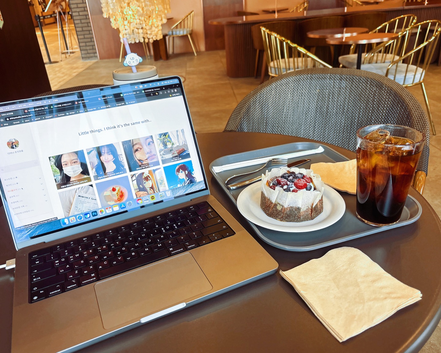 케이크+커피와 함께 글 쓰고 있으면 프리랜서가 된 것 같아 뿌듯하다