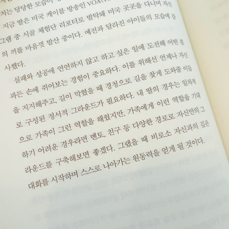 패와 성공에 연연하지 않고 하고싶은 일에 도전해 어떤 결과든 손에 쥐어보는 경험이 중요하다. 이를 위해선 언제나 자신을 지지해주고 길이 막혀있을 때 경청으로 길을 찾게 도와줄 이들로 구성된 정서적 그라운드가 필요하다. 그랬을 때 비로소 자신과의 깊은 대화를 시작하며 스스로 나아가는 원동력을 얻게 될 것이다.