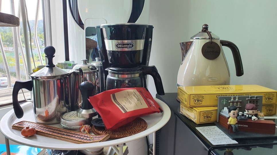 돈이 없을 땐 종종 드립 커피를 내려마셨습니다. 드롱기 드립 기계도 있고, 커피 페어에서 산 수동 도구들도 있어요. 스팀 밀크를 만드는 기계도 있구요. 드립 커피는 향이 정말 좋죠 😊😊 하지만 매번 세척하는 게 여간 불편한게 아니라서 지금은 데코 소품이 되어버린 아이들 ^_ㅠ