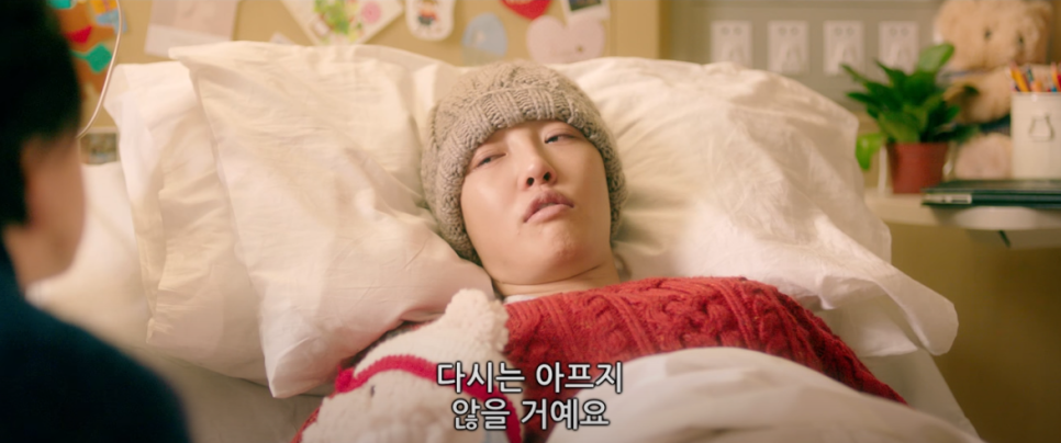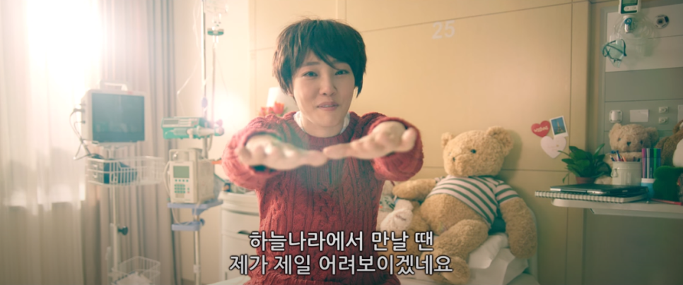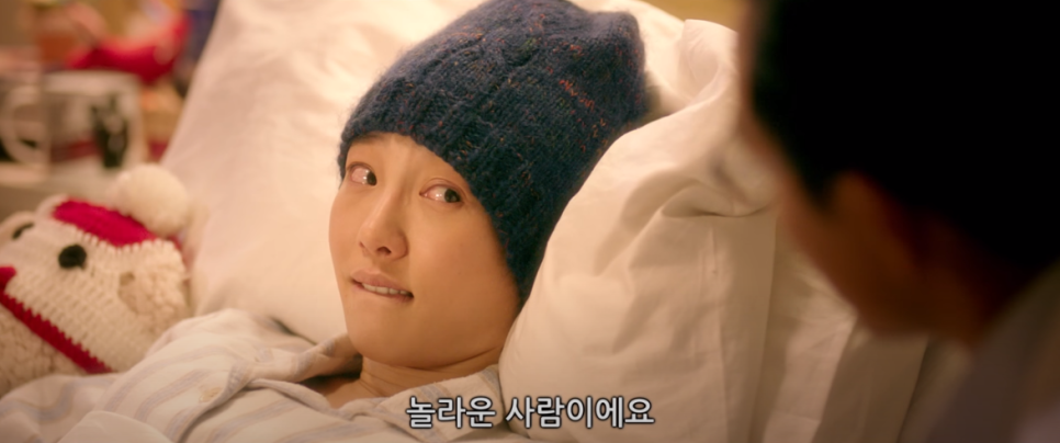 남자 주인공의 핸드크림, 생일선물로 줬던 자작곡 인형같이, 존재의 흔적들은 죽음의 사실을 더 명확하게 만든다. 영화에서는 그런 감정선들을 잘 살렸다. 특히 모태의 공간인 엄마에게 안겨 어릴때처럼 입술을 만지며 잠드는 여주인공의 모습은 죽음이라는 큰 두려움 앞의 작은 인간의 근본적인 행동이었다. 희망을 가지고, 냉정을 찾지만, 동시에 느끼는 두려움을 피해 태초에 나를 보호해주던 깊은 곳으로 떠나 안정을 느끼고 싶은 욕구를 말이다. 우정과 사랑, 가족애를 동시에 담아내었다. 사람은 사랑을 통해 성장해왔다는 걸 증명할 수 밖에 없는 장면이었다. 그래서 영화를 보며 웃고 울 수 있었다.