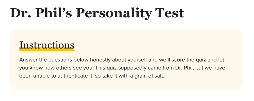 Instructions Answer the questions below honestly about yourself and we’ll score the quiz and let you know how others see you. This quiz supposedly came